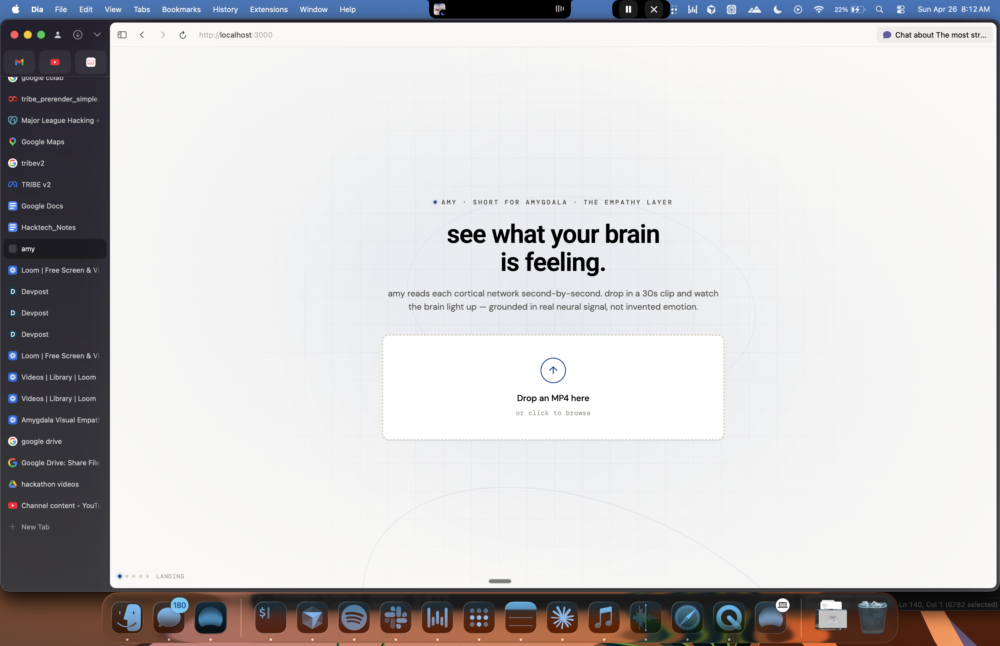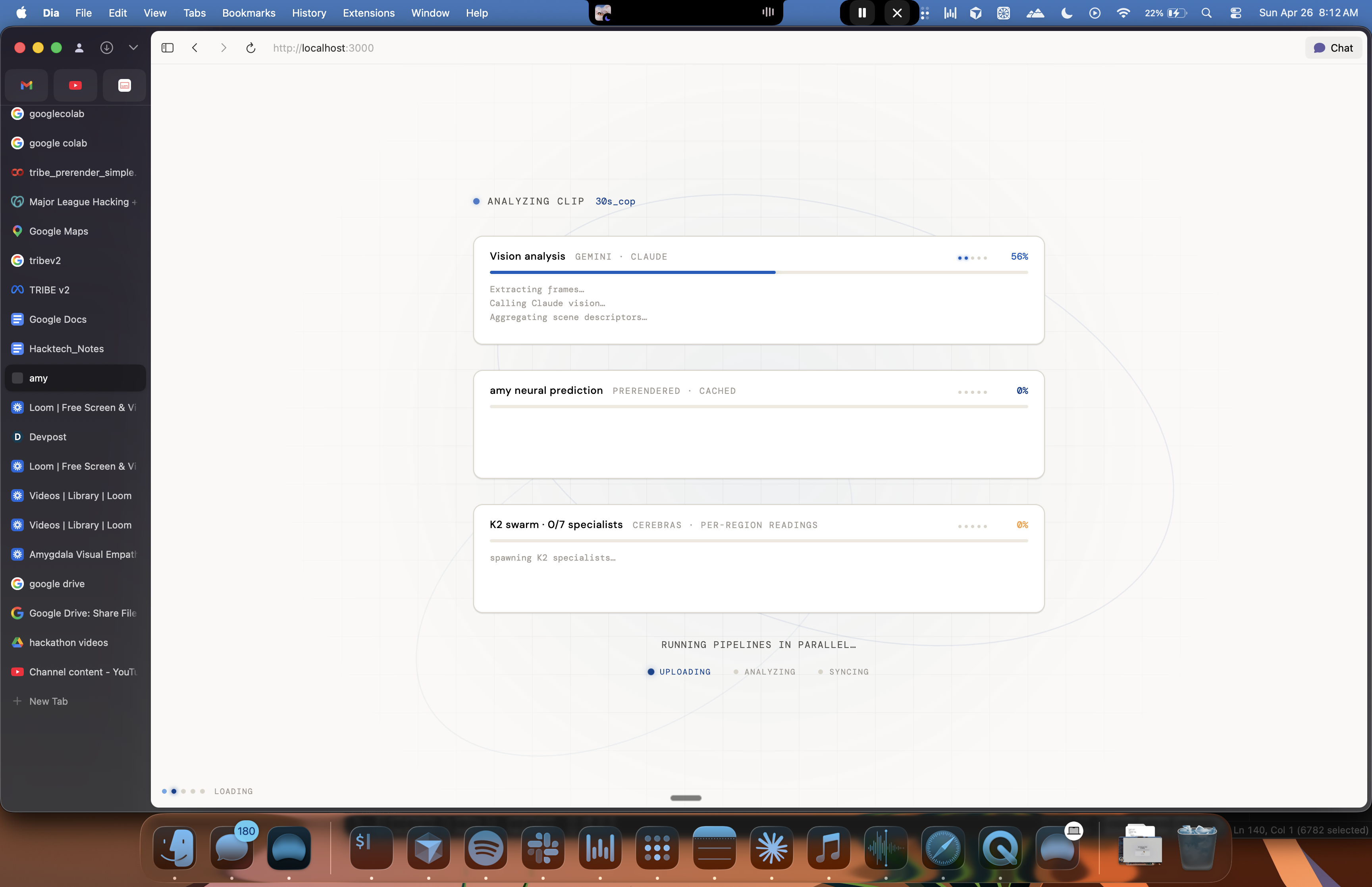 Honestly, the hardest part was processing the videos. The TRIBE V2 pipeline started in Jupyter and the notebooks were slow The frame extraction, brain-encoding inference, writing per-second activity JSON for ~20,000 vertices, all of it felt like it took an eternity. We ripped it out of the notebook into a parallelized batch pipeline to extracted the frames in one pass. Then, TRIBE V2 inference batched on a GPU, and the activity JSON was serialized into a compact streamable format. A 30-second clip went from minutes to seconds.