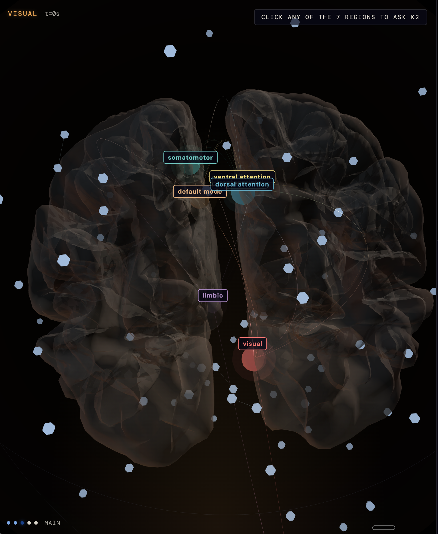 - A K2 Think swarm simulation w/Cerebras (~1,300 tok/s, seven specialists in parallel, one per Yeo7 cortical region) interprets what each region was contributing.