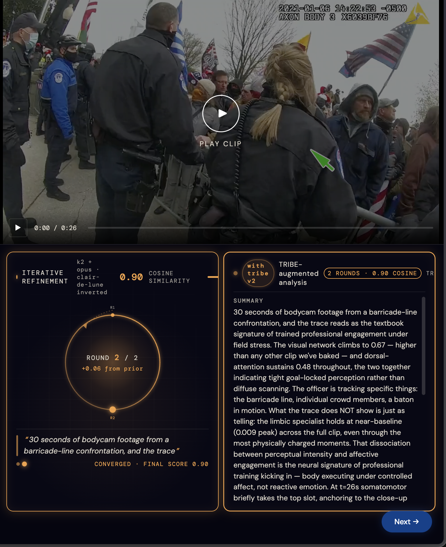 Brain-grounding is what separates genuine cognitive description from confabulation. Any LLM can write "she held space" if you ask it; the question is whether that paragraph would also score 0.85 against the actual brain pattern of the actual video. The score climbing is the falsifier. Without it, it's a style trick. With it, it's a measurement.