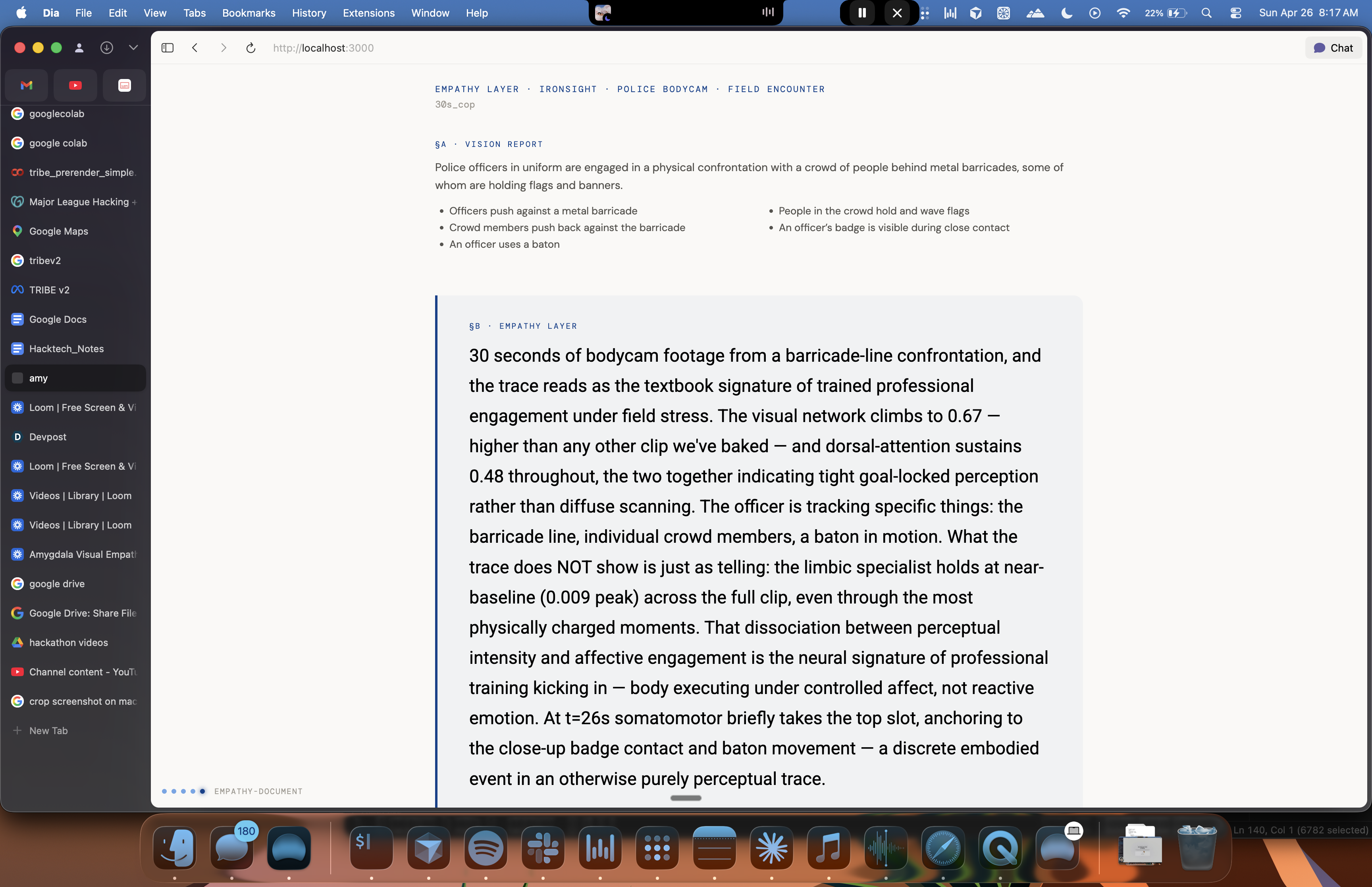- The empathy document mounts an Opus chat layer for live interpretive Q&A, grounded in the cached brain trace, hedged by design, with a forbidden list (no clinical claims, no sub-second predictions, no fabricated detail).