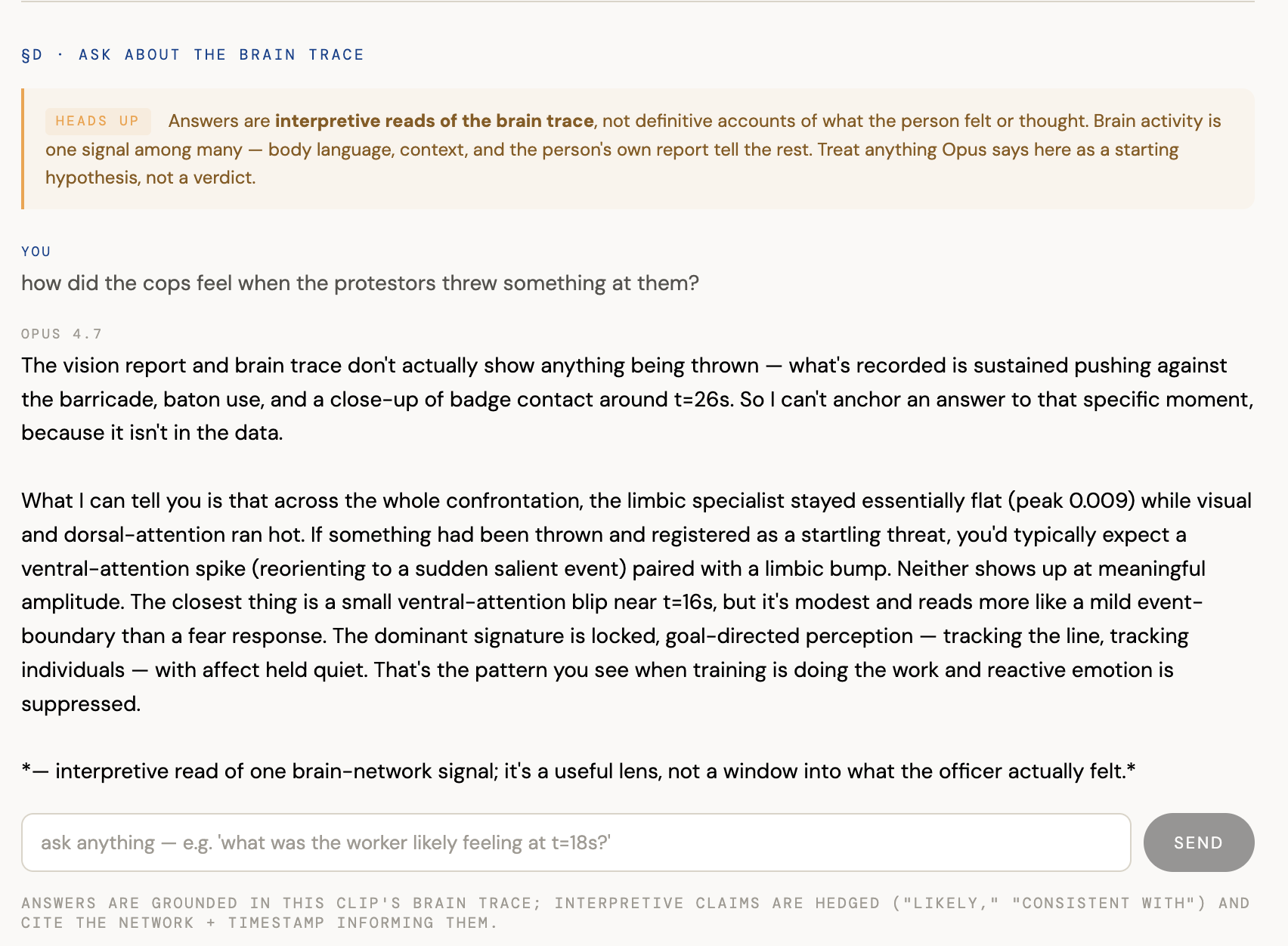 The empathy document also ships with an Opus 4.7 chat layer where viewers can ask follow-ups like "what was the worker likely feeling at 18s?" and get an answer hedged in calibrated language ("most consistent with focused inspection," "the limbic specialist stayed quiet through this stretch"), with every claim anchored to a specific network and timestamp from the trace. A persistent banner makes the contract explicit: these are interpretive reads, not definitive accounts of what someone felt.