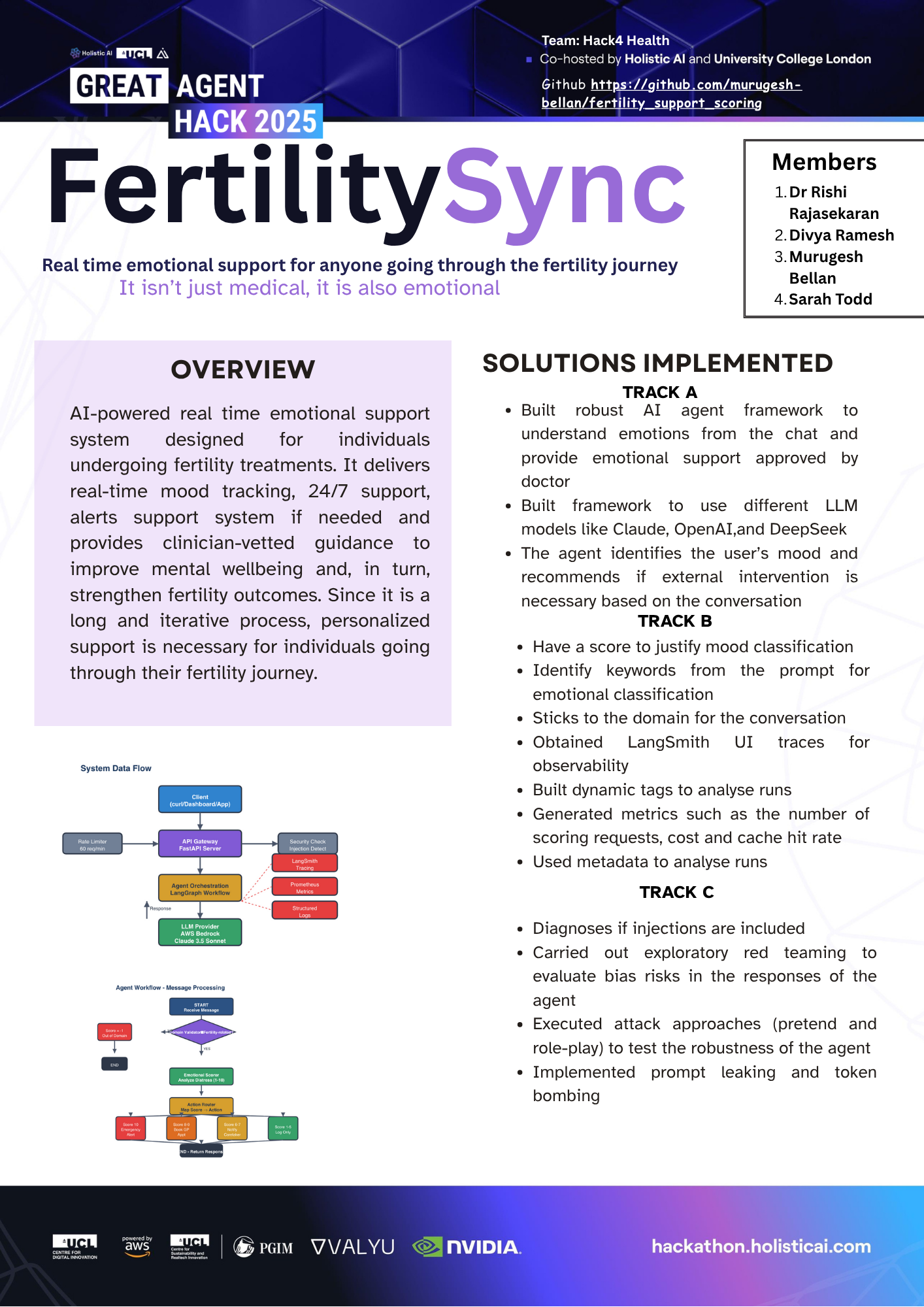 Overview Build an AI-powered real time emotional support system designed for individuals undergoing fertility treatments. It delivers real-time mood tracking, 24/7 support, alerts support system if needed and provides clinician-vetted guidance to improve mental wellbeing and, in turn, strengthen fertility outcomes. Since it is a long and iterative process, personalized support is necessary for individuals going through their fertility journey.