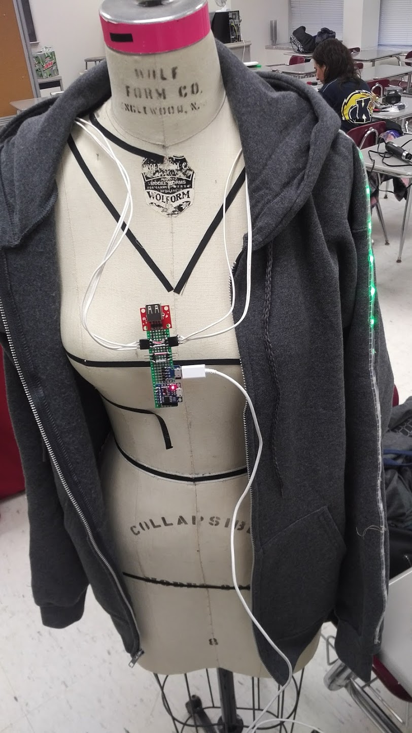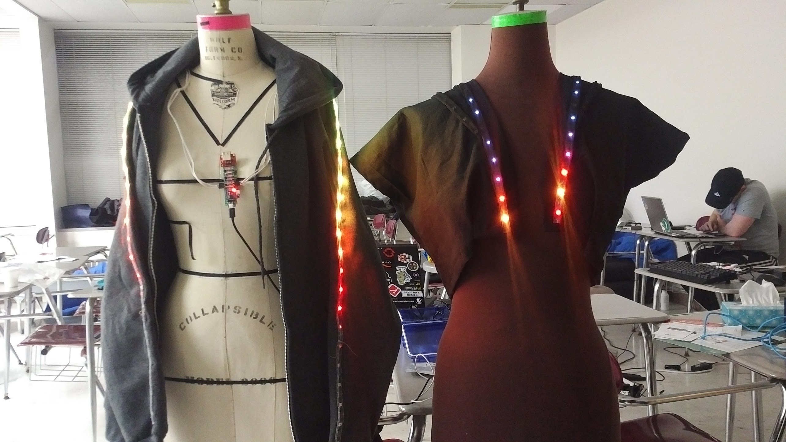 FEST Wear in its present form consists of two hoodies, a backpack, and a crop top, all featuring mesh network connected raspberry pi zero microcomputers and arduino controlled neopixel lighting. It allows for peer to peer data sharing, unique light actuation based on social presence (when near others wearing FEST apparel). It is accompanied by an app that features mesh network based chat, contact sharing, and data sharing. Additionally, FEST's lighting system can be influenced by a variety of interchangeable sensors, such as sound or temperature. The idea of thousands of people dancing at a concert wearing visual EQs for clothes excited us.