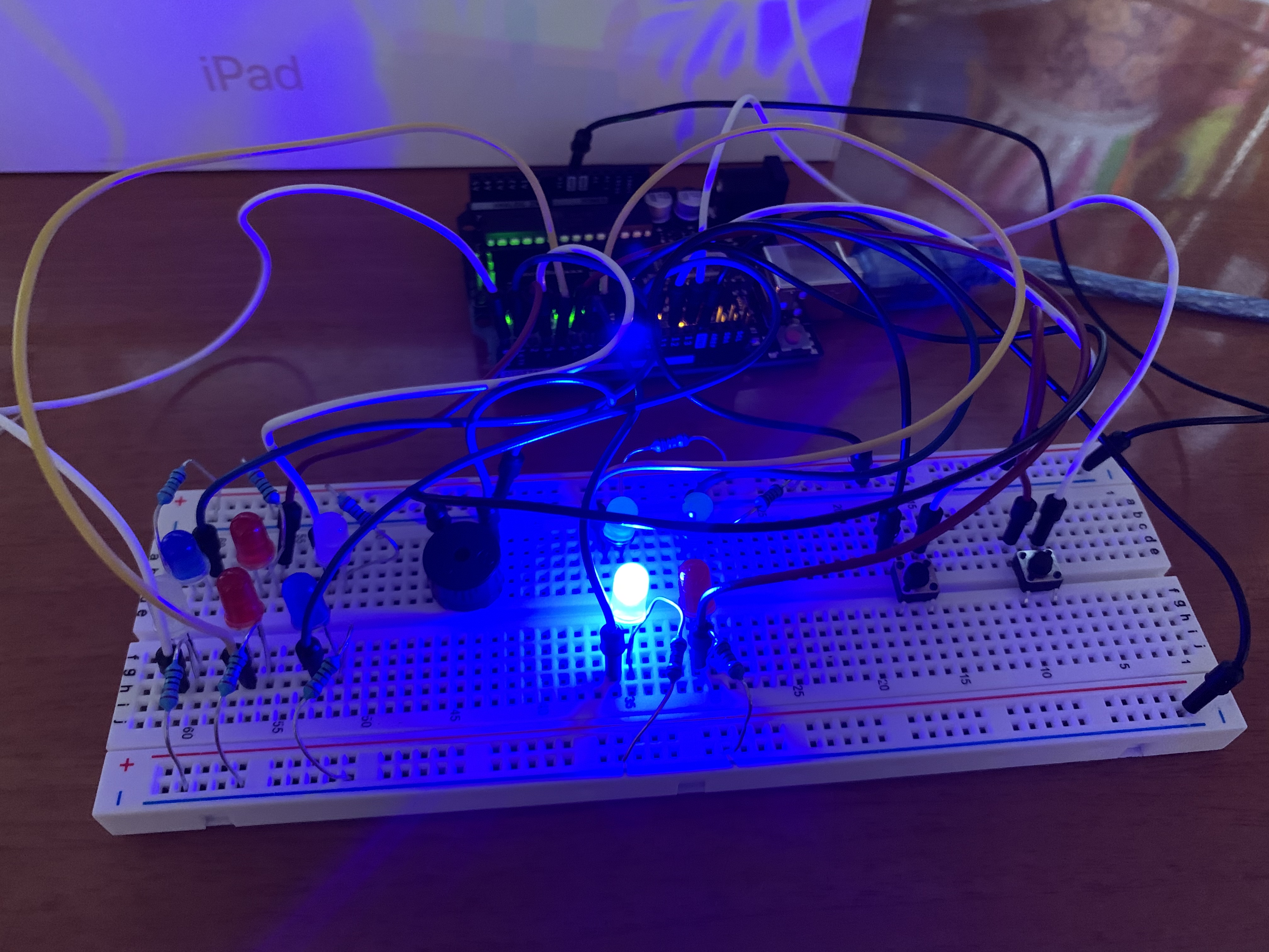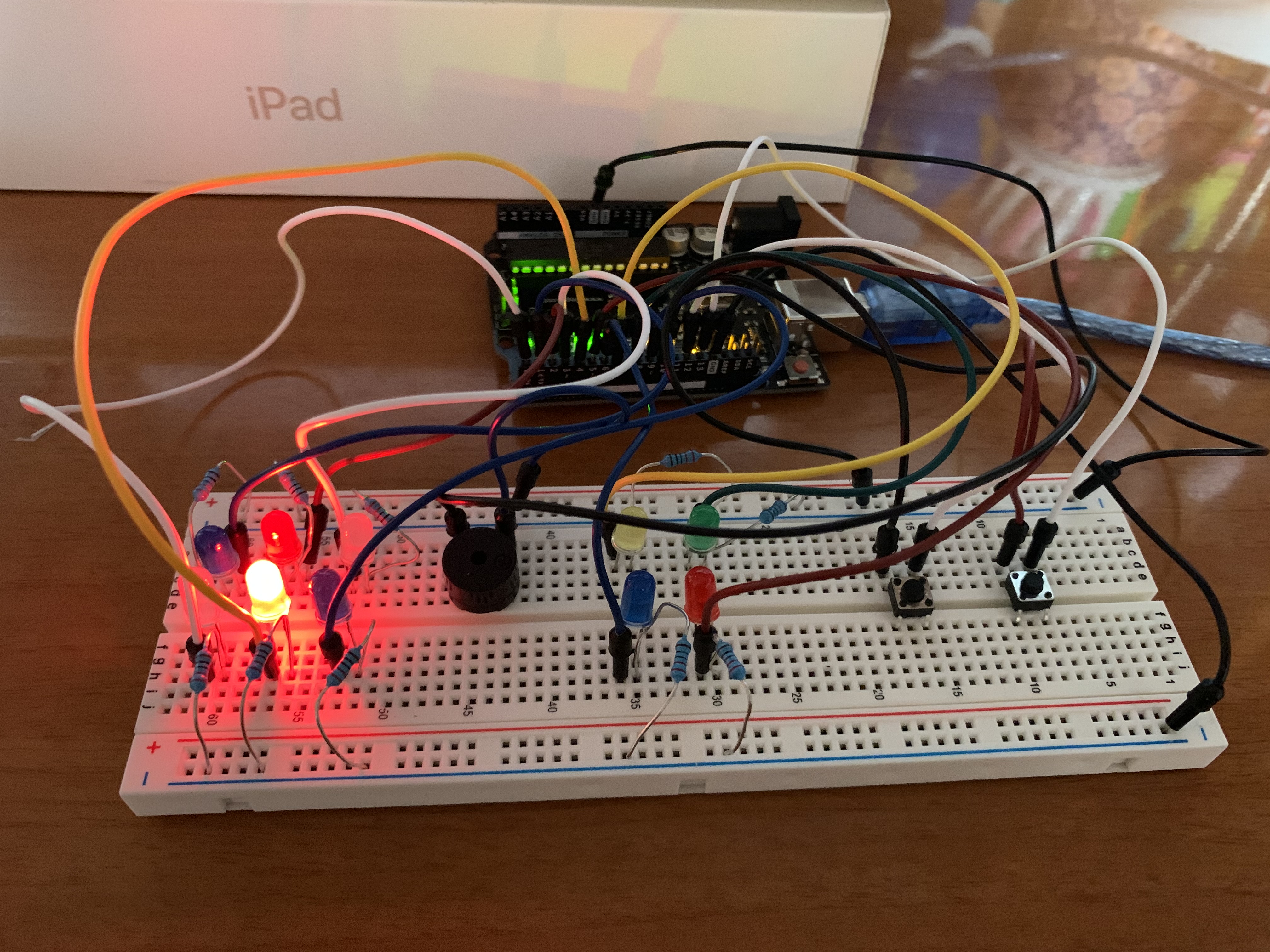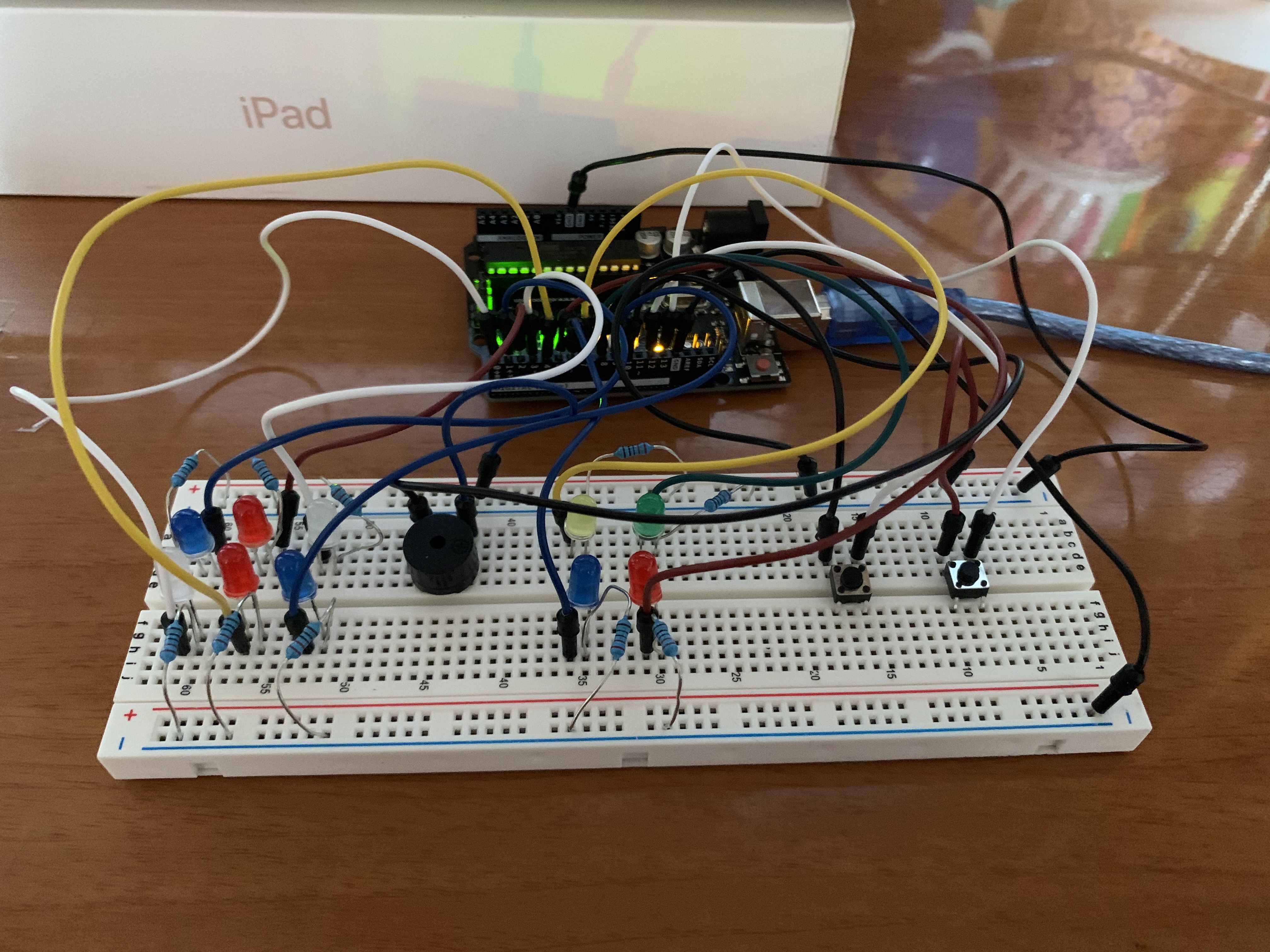 Using my Arduino kit with the Arduino board, LEDs, passive buzzer, resistors, wires, buttons, and a breadboard! And of course, coding was needed!