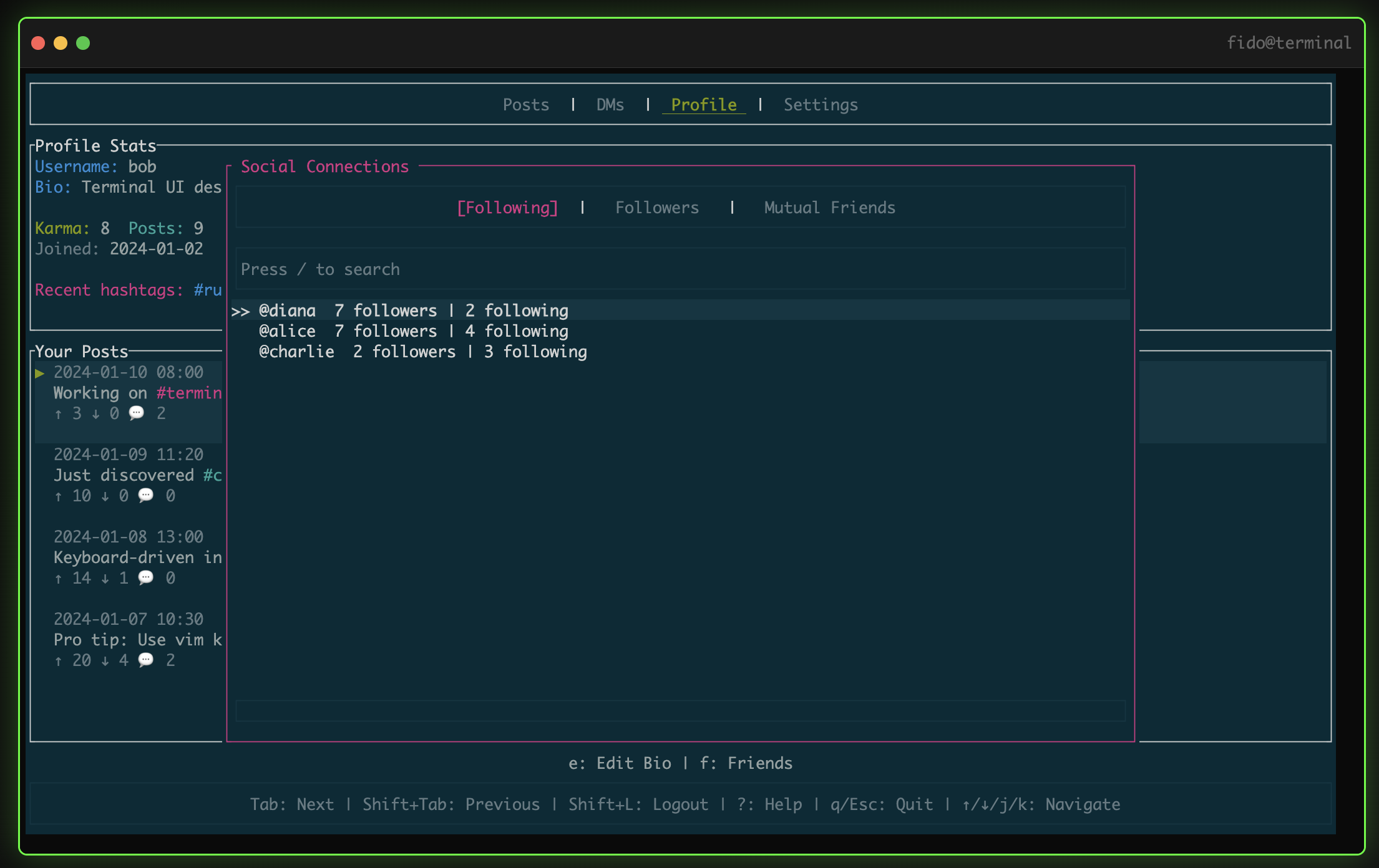 A TUI social platform inspired by the 90s BBS, Reddit, Twitter and built for speed.
