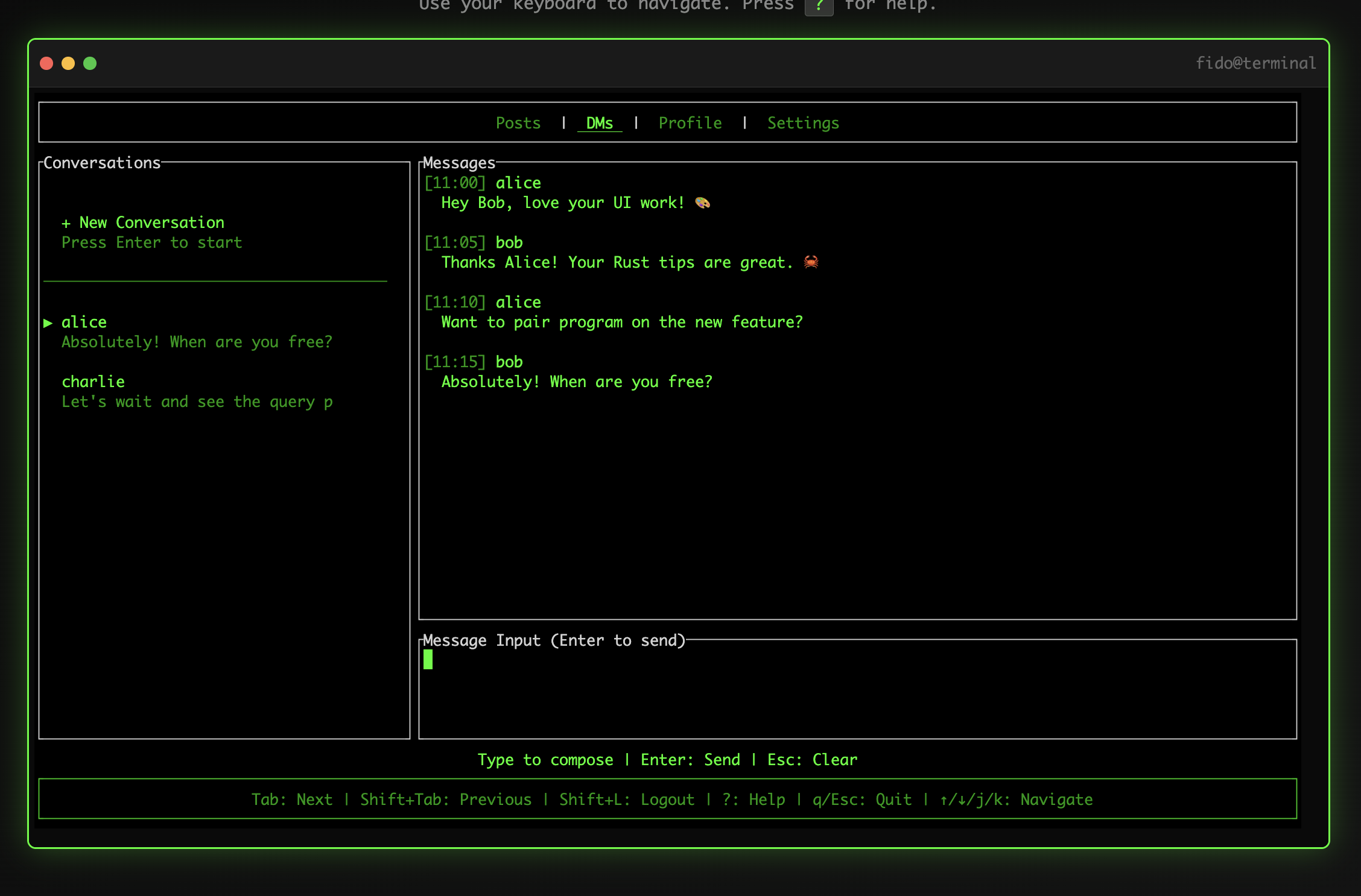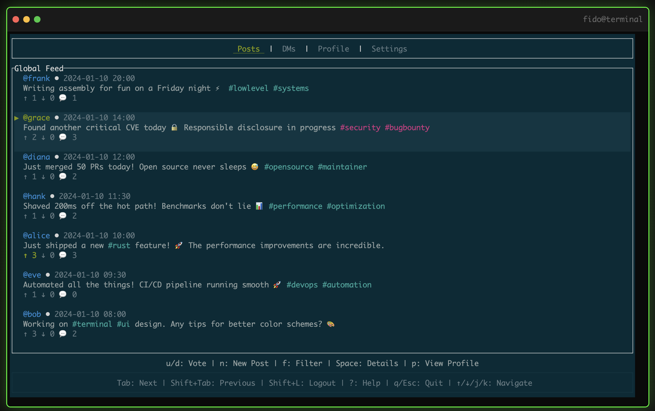 Install the crate, Log in with GitHub, Post, comment, upvote, downvote, DM, all from the comfort of the terminal.
