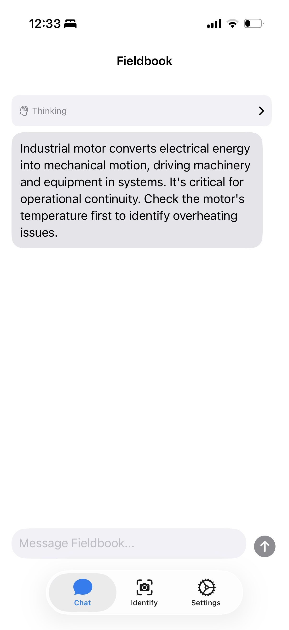 Fieldbook is a 100 percent offline, on-device mobile assistant for field technicians. Instead of wasting time typing paragraphs of context into a generic chatbot to explain a situation, a technician simply points their camera at the part. The app instantly recognizes the hardware category and offers three contextual actions: Troubleshoot, Summarize background info, or Setup. Once an action is selected, Fieldbook launches a localized, interactive chatbot designed specifically for conciseness. It completely cuts out the conversational fluff. Because the app already knows the hardware and the user's intent, the chatbot immediately delivers to-the-point baseline reference material. It provides the standard diagnostic trees, safety checks, and foundational context the engineer needs to structure their workflow with certainty. It gives professionals exactly what they need to start a repair, without forcing them to read a generated novel in the field.
