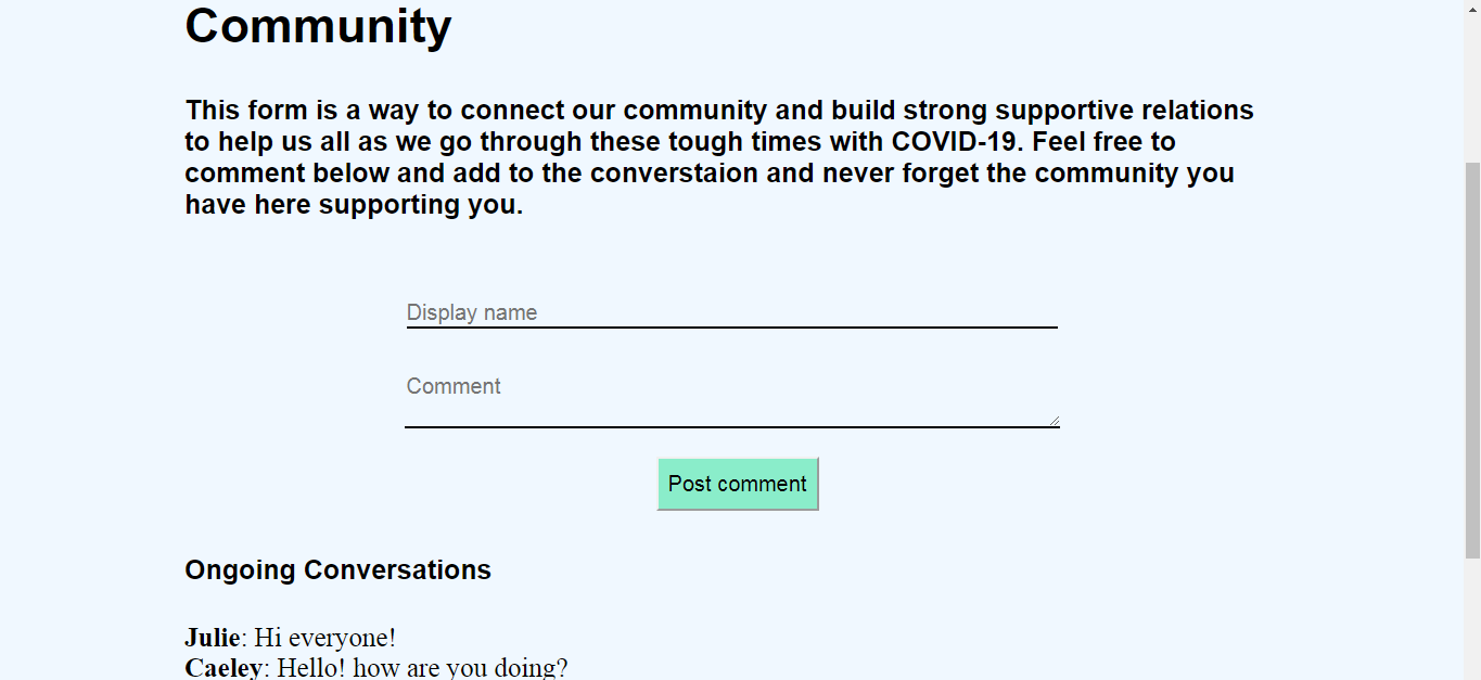 I created a website using HTML, CSS, and PHP to solve this issue. All the static parts of the website were made with HTML. These are the home, resources, and emergency pages. I did research on the mental and emotional impact that this virus has and what are the best, most efficient ways to reduce that impact. I used the PHP for the backend parts of the website. The HTML served as the vase layout but I combined it with PHP for the community and contact pages to accommodate the dynamic parts of the page. The community page collects the information for each comment using PHP and displays it using HTML. The contact page sends the information with PHP to my email address so that I can make updates accordingly. CSS is also used for styling the website and making it physically appealing and easy to use. I used Visual Studio and Brackets as editors while making my website to preview it before launching. I then used 000webhost to host it so that I can out it into action.