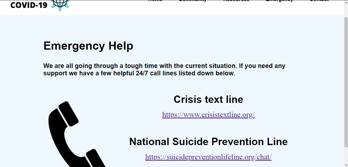 This website serves as a way to reduce mental health issues caused by COVID-19. Maintaining our mental health during this time is of utmost importance. This is because otherwise we will be unable to go back to our normal way of life an will be forced to adapt to new circumstances. We need to minimize the impact of the virus and this is the best solution I have found. The most important thing is to make this resource accessible to everyone. This is possible by making it a website that anyone can access anywhere at anytime. It is also free to access and harnesses the power of the community. The home page gives a little intro to the website. Then the community page brigs everyone together as a community. The purpose of this page is to help people build a supportive network to help them get through times like these. The resources page gives people access to various activities and other materials that are being provided to support people such as free online classes or suggestions for yoga. The emergency page is available to help anyone in a critical state as I know every second is precious and having everything in one place can make a big difference. Finally the contact page is just a way for me to make the website better. I have learnt that the best way to design a product is to use the customers feedback and this form will enable me to reach this website to its full potential.