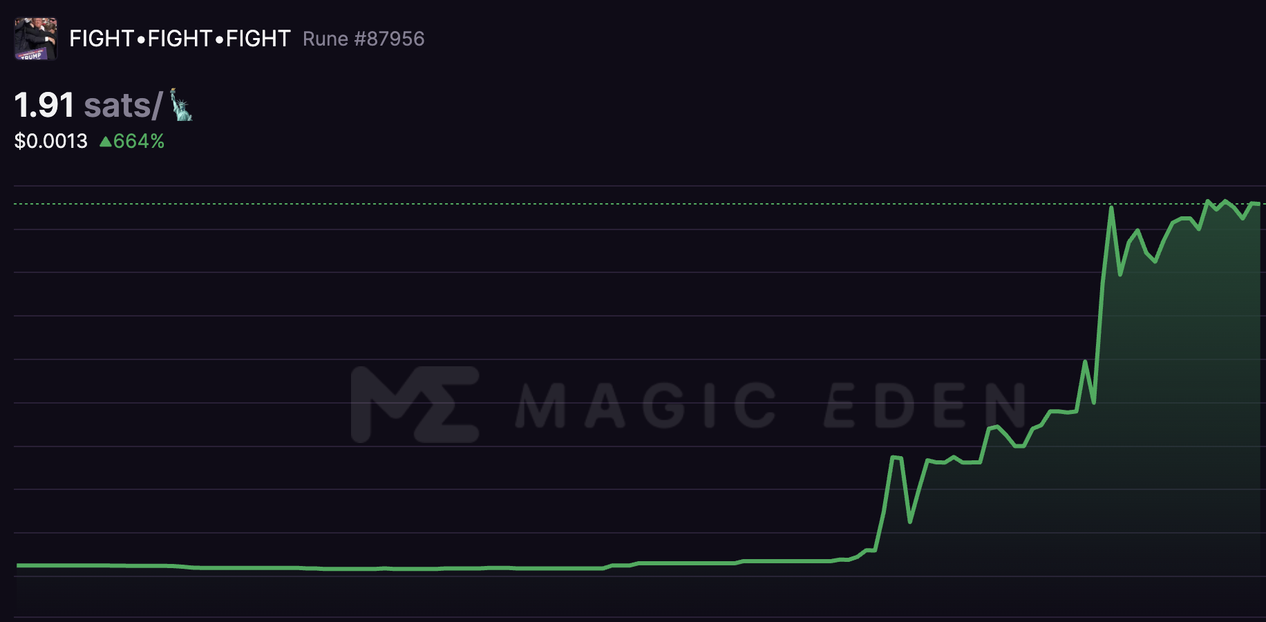 We are very proud of etching this important historic event onto BTC and releasing meme runes for people to be part of it. In addition, FIGHT•FIGHT•FIGHT was on Magic Eden Top Runes list!!