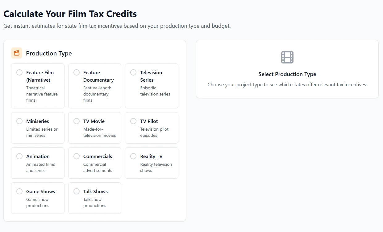 A comprehensive web application for calculating film tax credits and incentives across all 50 US states. This tool helps film producers, production companies, and industry professionals estimate potential tax benefits for their projects.