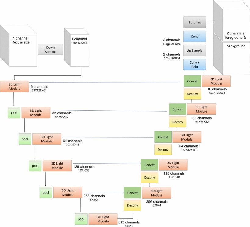 [7] mentions that 3D neural networks have strong potential for prostate MRI segmentation. However, substantial computational resources are required due to the large number of trainable parameters. They proposed a network architecture called V-net Light (VnL), which is based on an efficient 3D Module called 3D Light, that minimises the number of network parameters while maintaining state-of-art segmentation results. The proposed architecture replaces regular 3D convolutions of the V-net architecture [8] with novel 3D Light modules. Figure 2 shows the architecture of VnL. The original V-net model consists of encoder and decoder paths with convolutional layers. To reduce the number of parameters, [7] inserts pooling layers between the encoder stages. The novel 3D-Light Module is used in each stage of the encoder and decoder. The 3D-Light Module is a parameter-efficient 3D convolutional block consisting of parallel convolution blocks, blocks composed of regular convolutions, followed by a group convolution. It reduces the number of parameters by 88%−92% in comparison to V-net. The VnL achieves comparable results to V-Net on the PROMISE12 dataset [6] while requiring 90% fewer learning parameters, 90% less hard-disk storage and just 3.3% of the FLOPs.