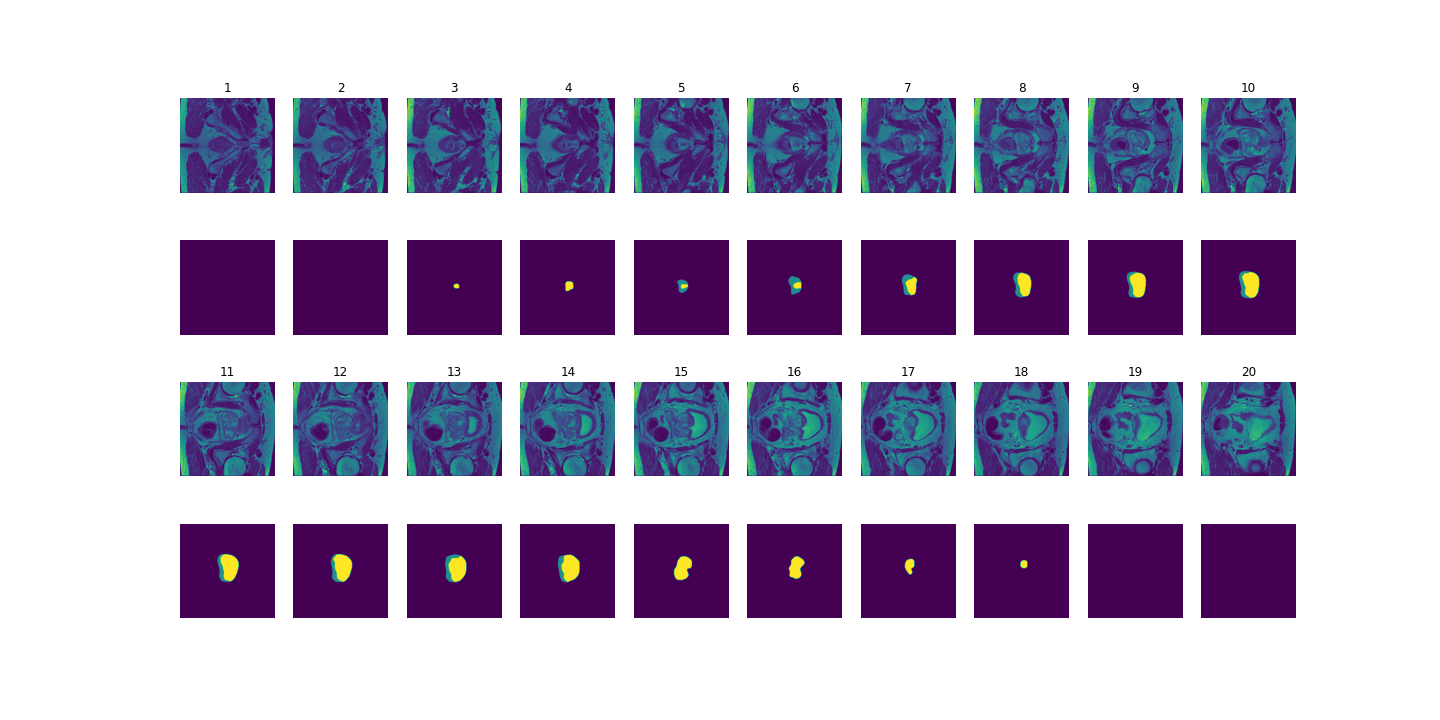 The prostate data set was acquired at Radboud University Medical Center, Nijmegen Medical Centre, Nijmegen, The Netherlands. It consists of 48 prostate multiparametric MRI (mpMRI) studies, 32 of them have corresponding region-of-interest (ROI) targets (background= 0, TZ= 1 and PZ= 2). Each study contains approximately 15 to 20 slices of MRI images, resulting in 602 images in total. Figure 3 shows the 20 slices from one study. The first and last few MRI slices contain little segmentation information. Therefore, to simplify the problem, we will discard the first and last 5 MRI slices from each study. We will use 10 studies (95 images) as the test set and the remaining 22 studies (187 images) as the training set.