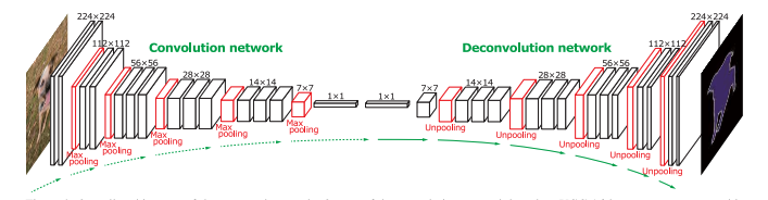 The DeConvNet [13] is designed on top of the convolutional layers adopted from the VGG 16-layer net [12]. As shown in Figure 5, DeConvNet is composed of convolution and deconvolution networks, where the convolution network acts as the feature extractor and the deconvolution network is a shape generator. The proposed architecture aims to overcome two limitations of FCNs. First, using FCN models, label prediction is done with only local information for large objects. Also, FCNs often ignore small objects and classify them as background. Second, in FCN, the input to the deconvolutional layer is too coarse and the deconvolution procedure is overly simple.