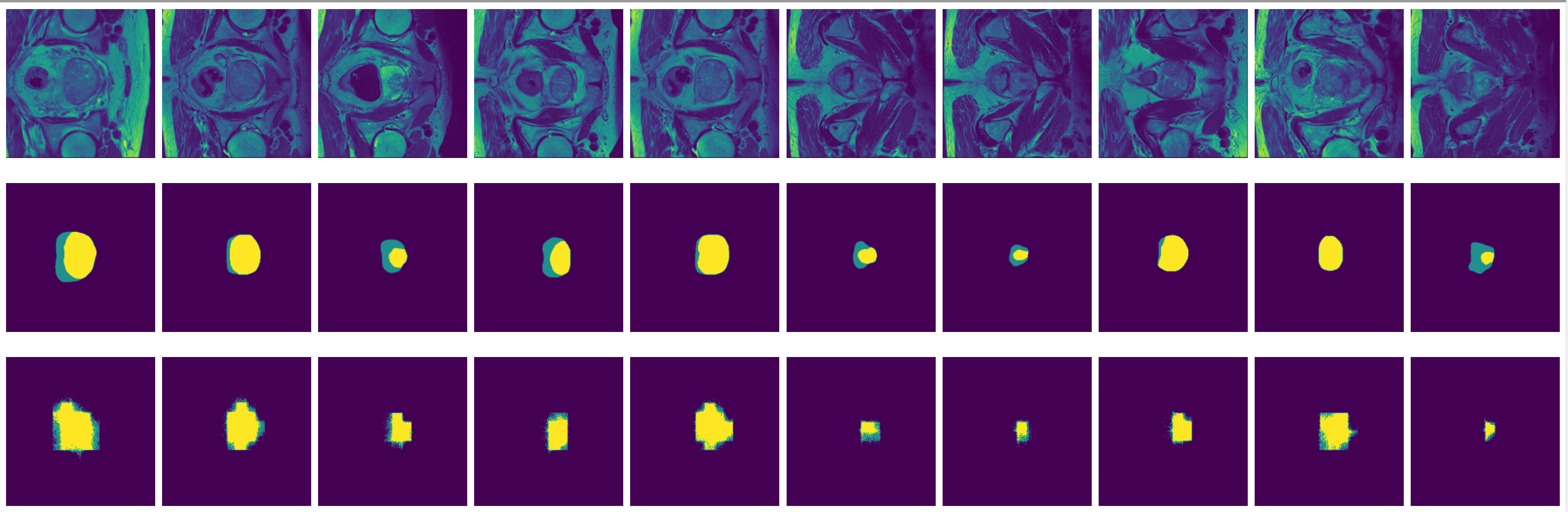 Figure 3: MRI slices (first and thrid rows) from one study with labels (second and fourth rows).