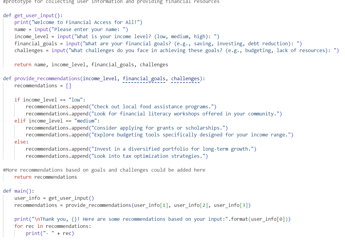 We are proud of several key successes for our "Financial Access for All" web application project: first, identifying a critical need in financial resources within underserved communities and providing a comprehensive app concept to help fix the problem. We outlined a range of features, including personalized financial resources, budgeting tools, educational modules, and a searchable database of local community programs focused on increasing financial literacy and access. Our team prioritized accessibility by the user through designing our app to handle multilingual support, visual aids, and intuitive interface design so it would be beneficial to a variety of backgrounds and abilities. We also performed well as an effective team in sharing knowledge and skills related to the challenge and provided opportunities for a supportive learning environment. Design: Even though this is a challenge for us because we aren't that skilled artistically, we have gathered inspiration and resources in learning how to do good design. This led us to create a detailed prototype outline that depicted the fact that we were able to turn ideas into forms and prove our commitment to equality in finance, contribution to the community.