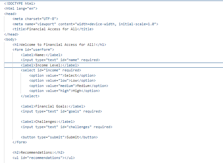 In the process of this "Financial Access for All" web development, we gathered knowledge that will come in handy in our next projects. We know that there has to be substantial research so that the real needs of the community are realized and solutions offered to effectively meet those needs. Working in a team was helpful to us since we acquired the skill of leveraging each other's strengths and recognized opportunities for improvement, such as in coding and design. We also learned from user-centered design principles that taught us to embed accessibility and inclusivity from the very beginning. Secondly, overcoming technical hurdles has had a positive result on our problem-solving skills, stretching us to find resources and learn skills that we did not know how to do at the beginning. Generally speaking, this experience broadened our knowledge with respect to financial literacy and community support and contributed to personal growth and teamwork.