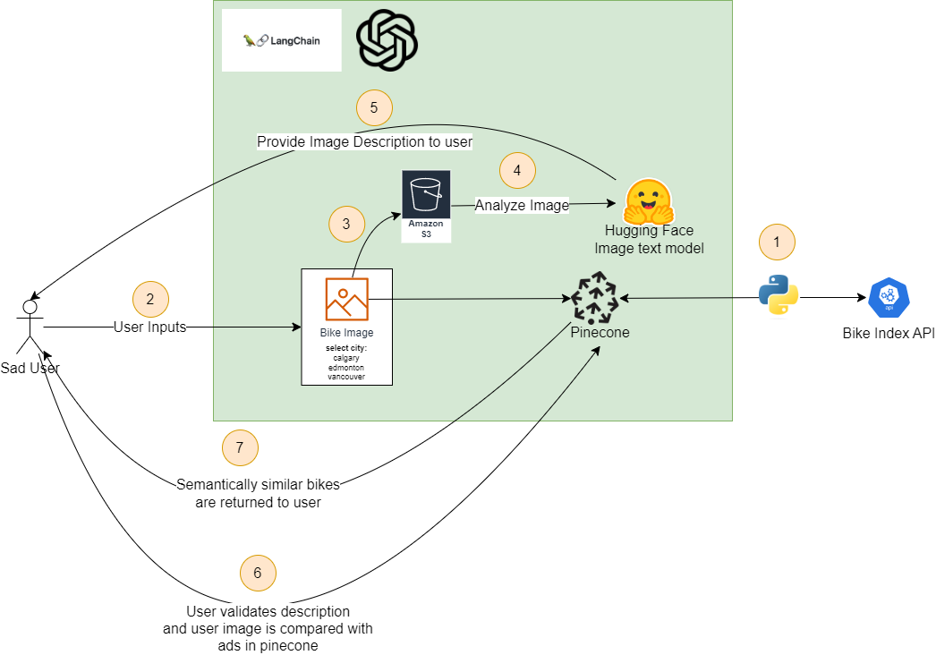 - pinecone: used to store vector embeddings of pictures from ads on bike index