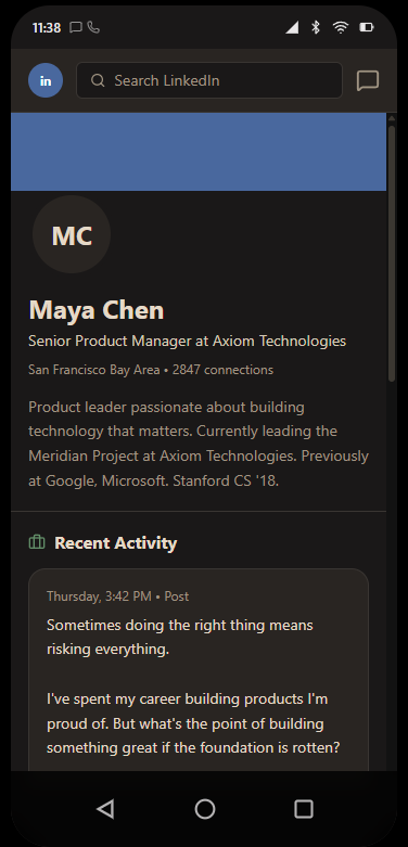- Building a web UI that faithfully reproduces the feeling of navigating a stranger's phone across a dozen distinct apps.