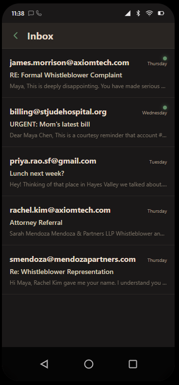 Working through a web interface designed to look and feel exactly like a smartphone, you dig through Maya's digital life. You check her messages, emails, photos, maps, notes, and transaction history to piece together what she discovered, who she trusted, and who she feared. The evidence is carefully layered, but the story you build from it is entirely your own. An AI story engine tracks your discoveries and shapes how the narrative responds to what you have found so far.