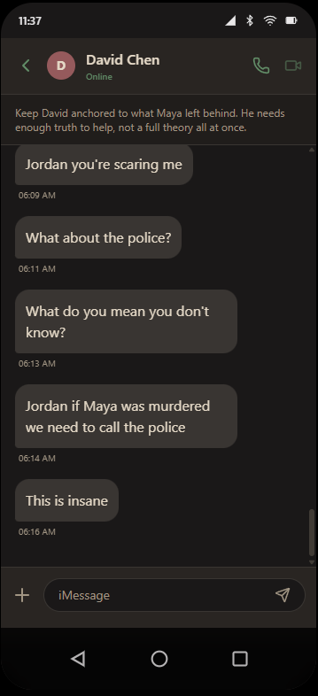 Most mystery games rely on pre-written paths. Once you figure out the developer's logic, the magic fades. We loved the "found phone" genre and the intimacy of piecing together a stranger's life through their messages, photos, and apps. We wanted to push that concept further. Our goal with Finding Maya was to build a mystery that adapts to how you investigate, rather than one that just waits for you to find the right answer.