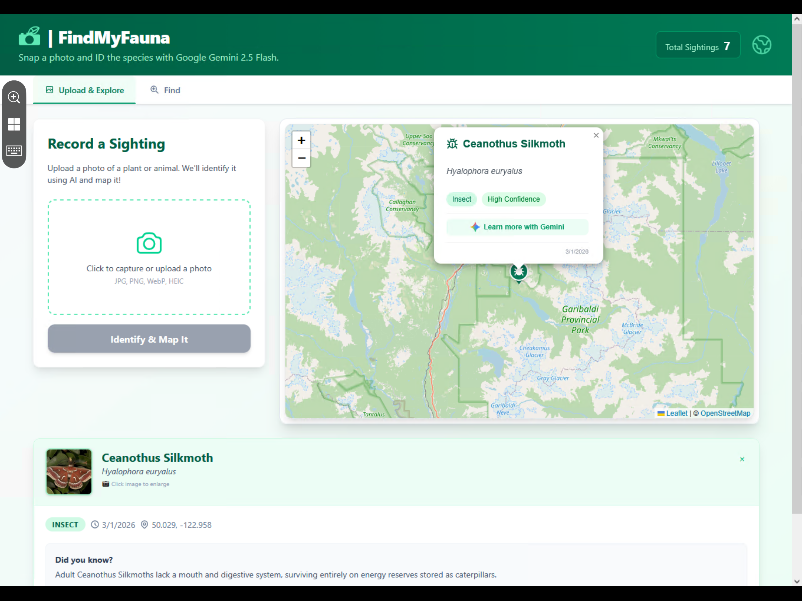 AI: Google Gemini 2.5 Flash handles all AI tasks, as well as species identification from photos, detailed species descriptions, and ecological region summaries. We use the official @google/genai SDK and prompt Gemini to return structured JSON, which we rigorously validate server-side before processing.