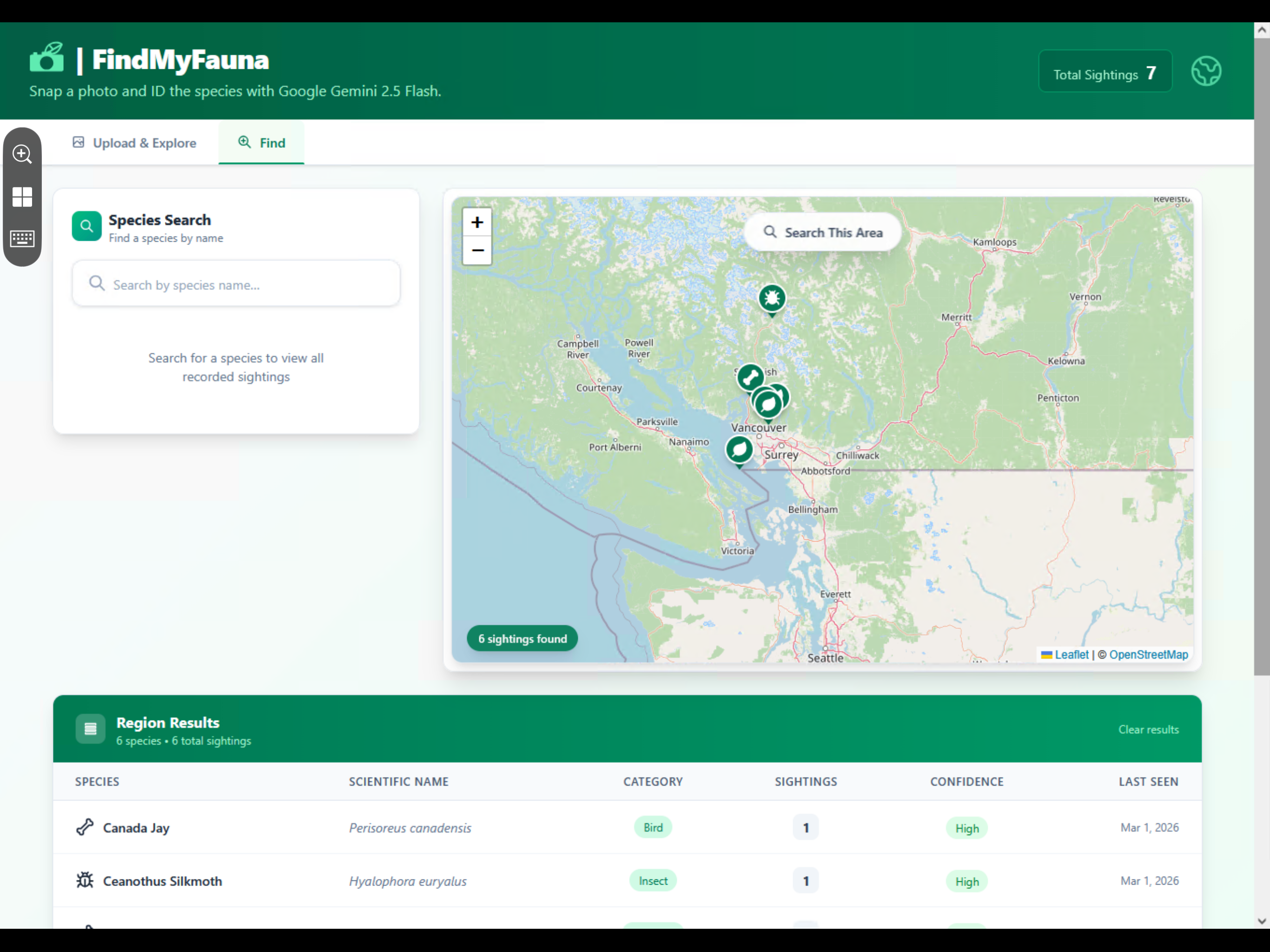 FindMyFauna is a web application that lets anyone photograph a plant or animal, instantly identify it using Google Gemini 2.5 Flash, and pin the sighting on a live interactive map, building a real-time, crowd-sourced biodiversity database.