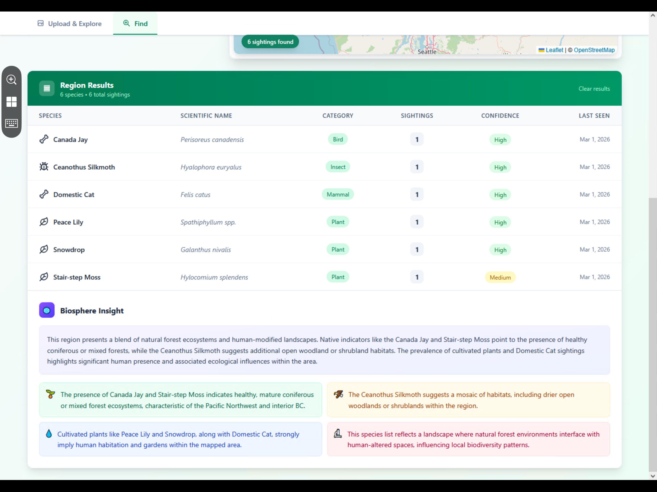 - Biosphere insights β The AI can analyze all species in a map region and generate ecological observations about biodiversity patterns, habitat health, and notable species relationships.