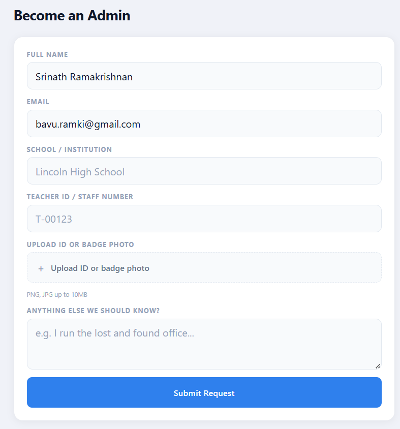 School lost and founds are a mess: a cardboard box nobody checks, items sitting for weeks on a decaying table, no visibility, and a high lack of man. We wanted to modernize the process and actually give students some hope in reconnecting with their lost items.