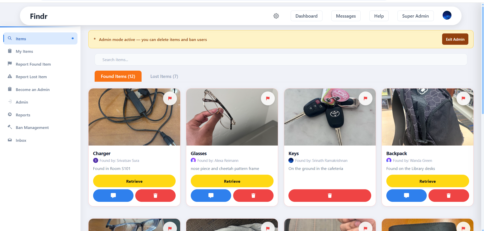 Findr lets students report lost or found items with description, location, and picture functionality, browse a searchable item listing, and message claimants directly, all within a secure, school-authenticated platform. Admin features allow for easy reporting and removal of items along with an admin approval system for schools to easily adapt the system.