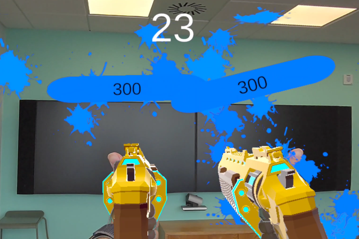 Inspired by Nintendo’s game "Splatoon" and the finger gun games we played as kids, players can rearrange the room and use the furniture as cover, painting everything in the room! We believe playing Splatoon in a real room will be incredibly fun.