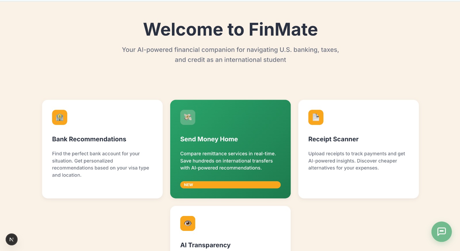 FinMate is a comprehensive financial management platform specifically designed for international students in the United States. The application addresses the unique financial challenges faced by international students, including money transfers, banking without SSN, receipt management, and financial literacy.