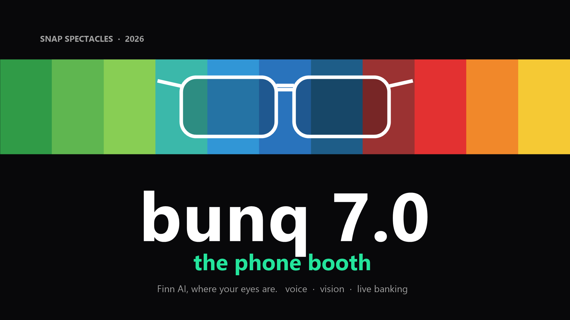 Every concept we built is grounded in bunq's real 2026 direction (Updates 30 and 31) — no sci-fi, just existing Finn capabilities given a body through Snap Spectacles.