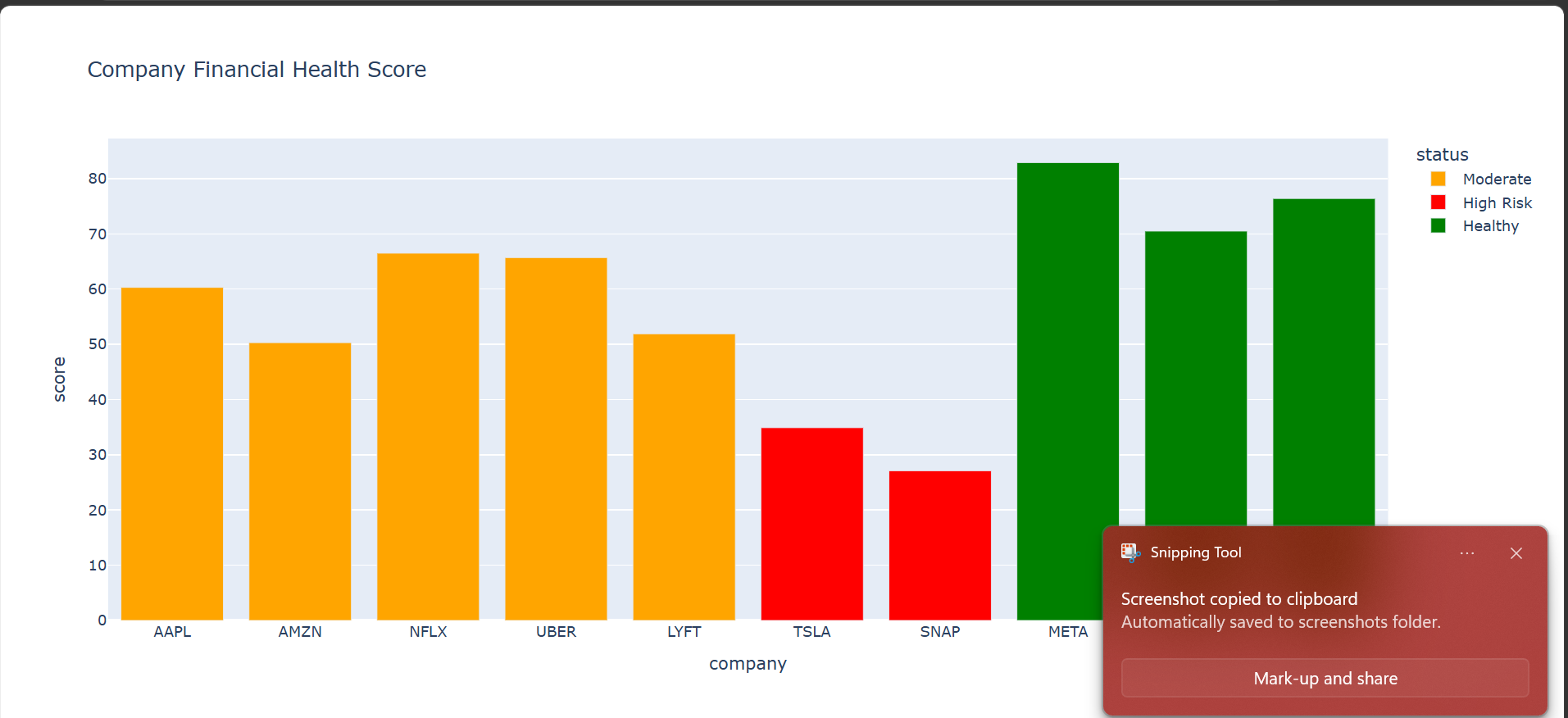 1) Fetches live financial data for any public company using Yahoo Finance API 2)Calculates a weighted Health Score across 4 critical financial metrics 3)Visualizes results as interactive color-coded charts for instant insight
