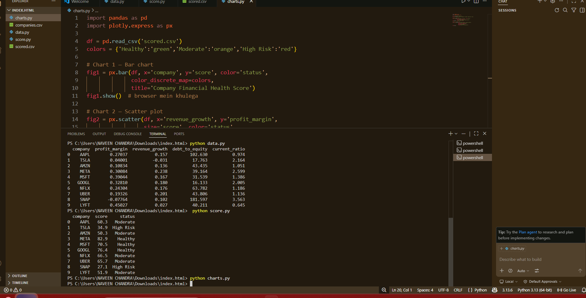 Python — core language yFinance API — fetched real-time financial data of 10 companies Pandas — data cleaning and score calculation Plotly — built interactive visual charts VS Code