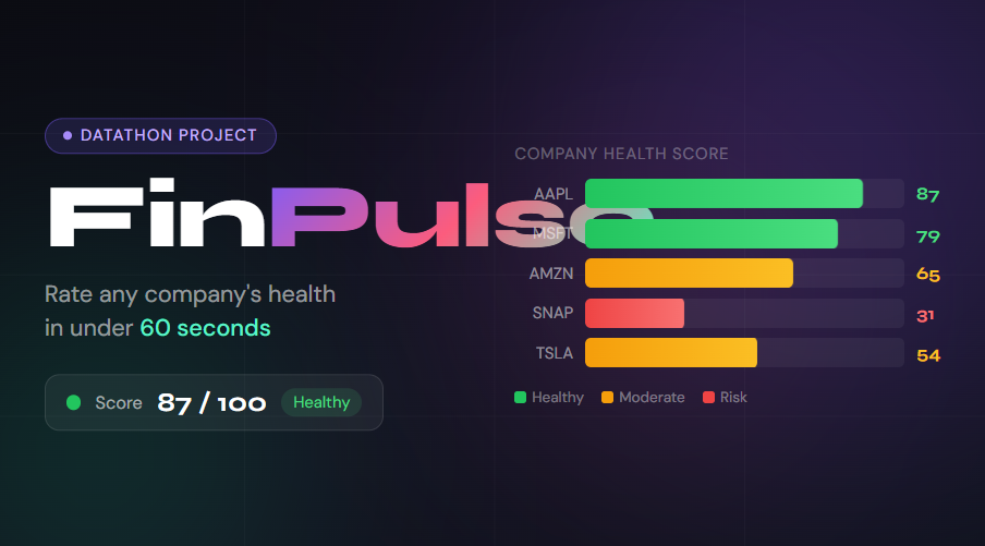 Every day, millions of students and retail investors make financial decisions without truly understanding a company's health. Reading balance sheets, income statements, and financial ratios requires expertise that most people simply don't have — leading to poor investment choices, missed opportunities, and unnecessary risk. There is no simple, unified way to quickly assess whether a company is financially strong or heading toward trouble. Existing tools are either too complex, too expensive, or designed only for professional analysts. FinPulse solves this by converting four key financial metrics into a single, easy-to-understand Health Score from 0 to 100 — making company analysis accessible to everyone, not just Wall Street.