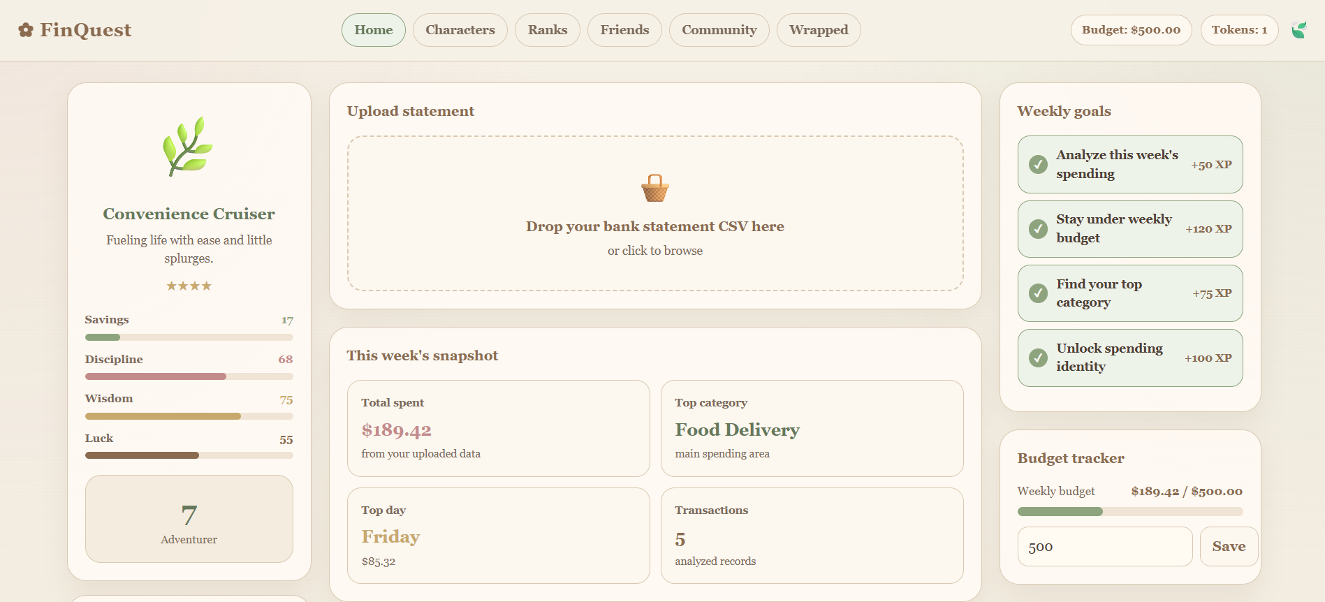 FinQuest is a “Financial Wrapped” app that analyzes transaction data and turns it into a personalized spending identity.