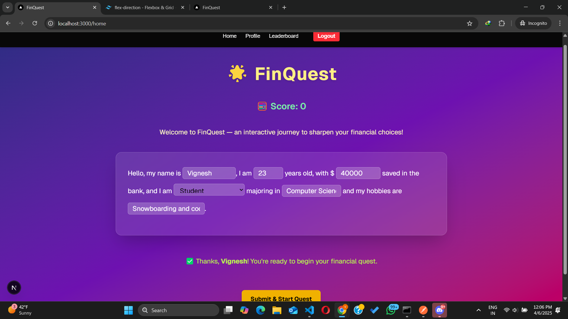FinQuest was born out of the need to make financial literacy engaging and practical for young people. We recognized that traditional financial education often feels disconnected and theoretical. By leveraging interactive storytelling and real-life financial scenarios, FinQuest transforms the way users learn about managing money—making it both fun and impactful.