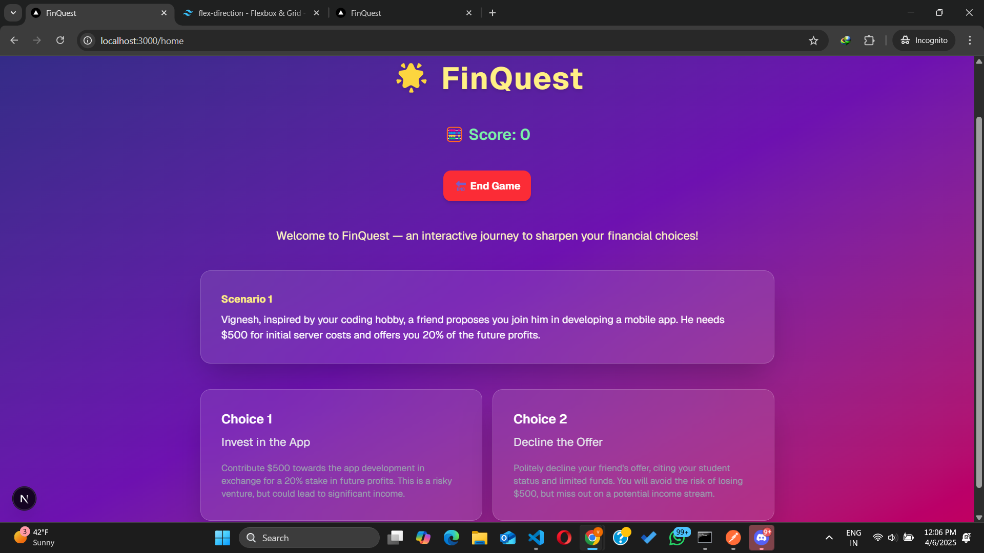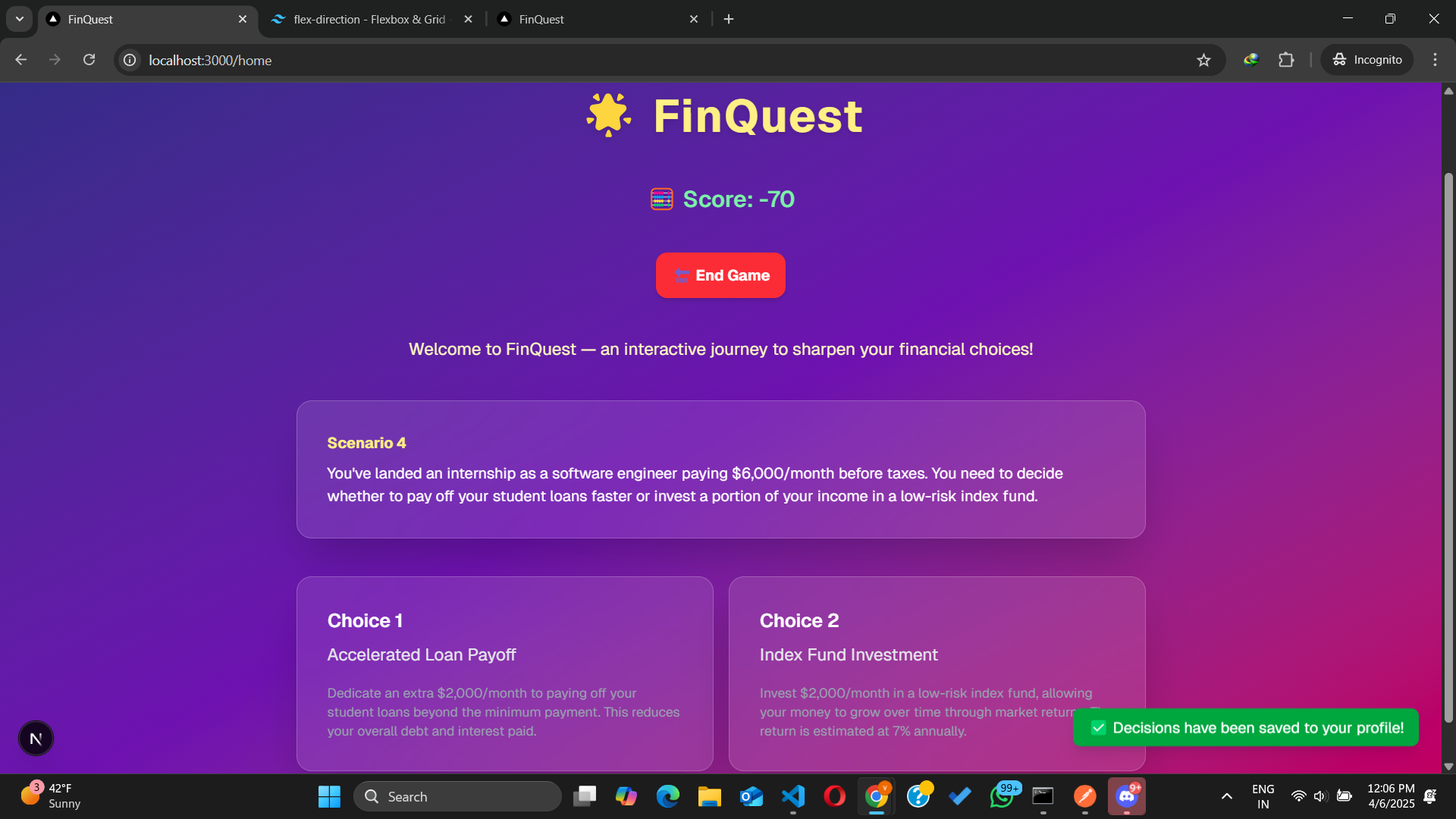 - Dynamic Scenarios: Users are presented with realistic financial scenarios, each with multiple choices that impact their virtual savings.