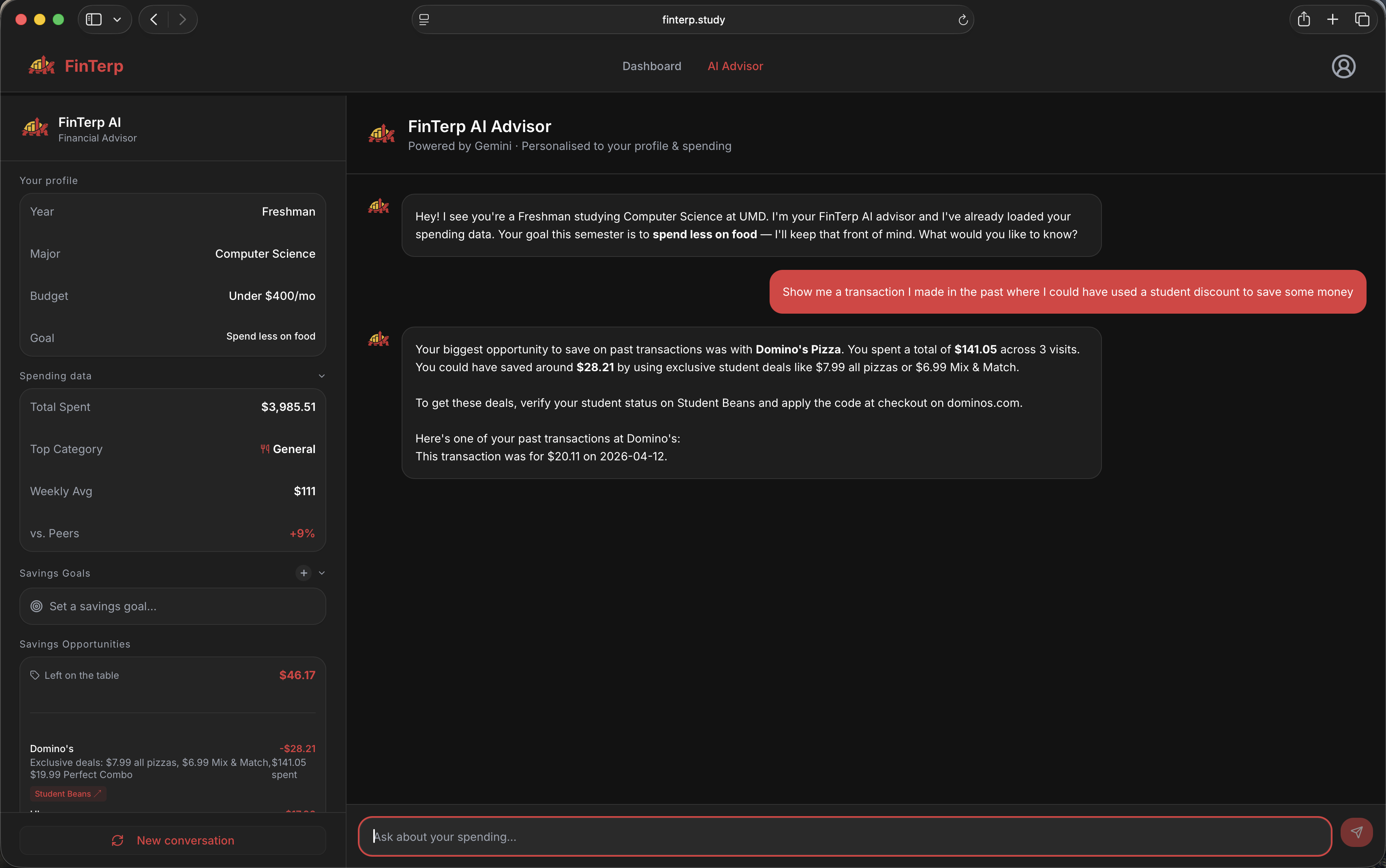 The project also goes beyond simple tracking by adding more personalized analysis tools. It includes an AI-based financial advisor that gives insights based on each student’s spending patterns and profile, suggests relevant student discounts, and helps create practical savings plans tailored to their habits. Overall, FinTerp combines transaction analysis, heatmap-based geographic spending visualization, and personalized guidance into a student-focused financial wellness platform.