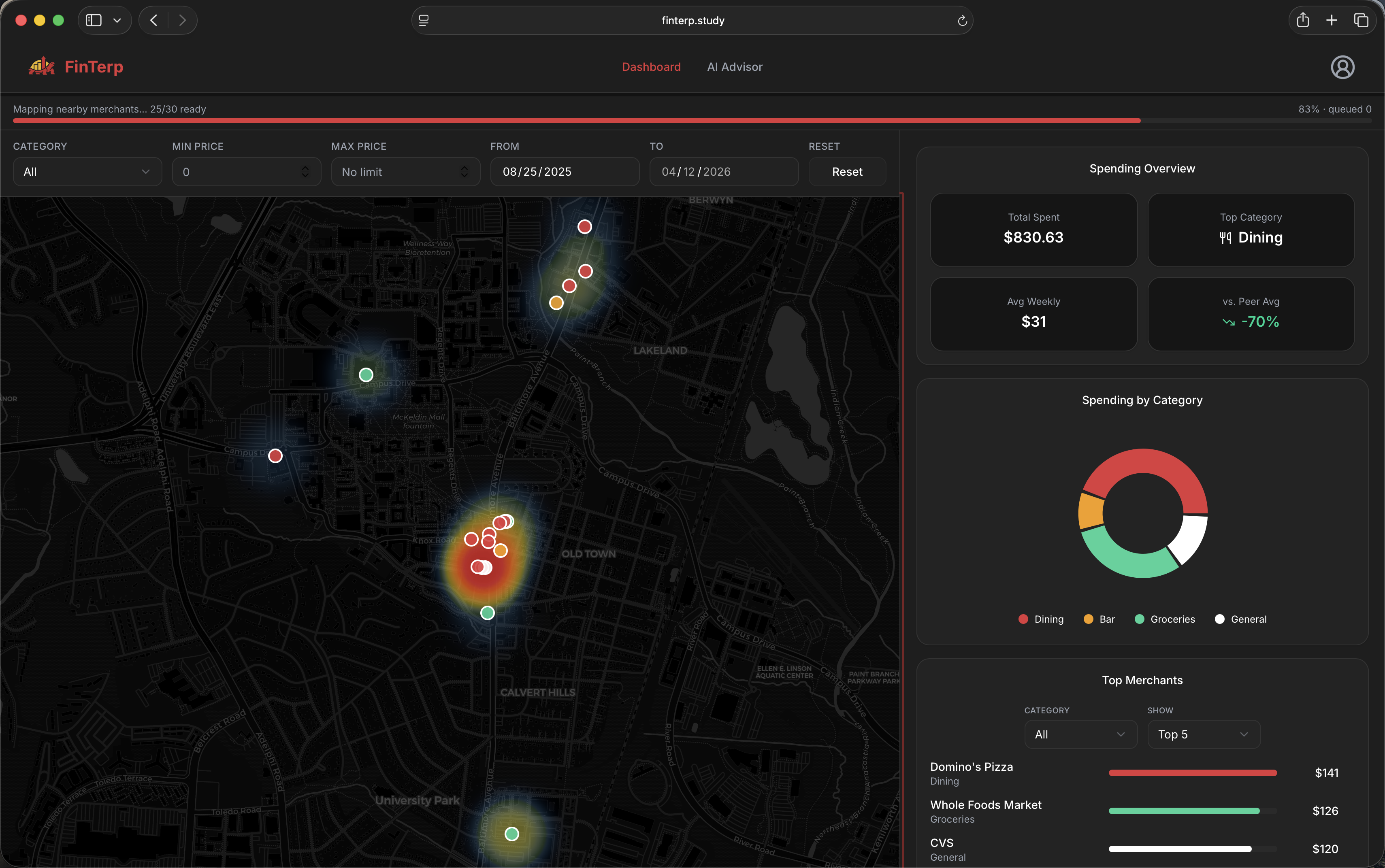 A central part of that experience is the heatmap, which gives users a geographic view of their spending patterns. Instead of just showing purchases as isolated points, the heatmap reveals where spending is concentrated, making it easy to spot the areas where a student spends the most money over time. This turns raw transaction data into a visual pattern that is much more intuitive to understand at a glance. In addition to the heatmap, FinTerp uses charts and other dashboard elements to break down spending trends, merchant frequency, and overall habits, helping users see both the geographic and financial side of their behavior in one place.