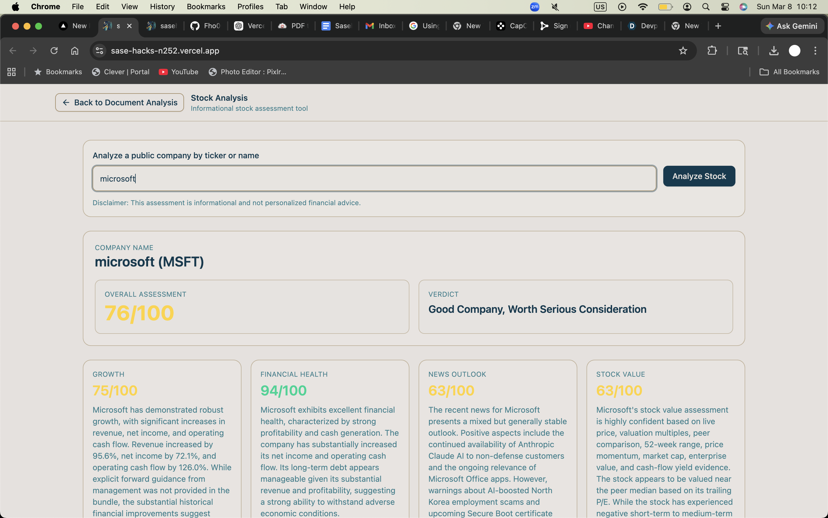 For the stock analysis workflow, the backend resolves a company by ticker or name, gathers evidence from news sources, extracted article text, SEC filings, market data, and peer valuation, then sends a normalized evidence bundle to Gemini for structured reasoning. After that, the backend applies deterministic scoring formulas to compute the final category scores and overall assessment. We intentionally kept scoring and weighting in backend code so the most important business logic would stay stable, inspectable, and consistent.