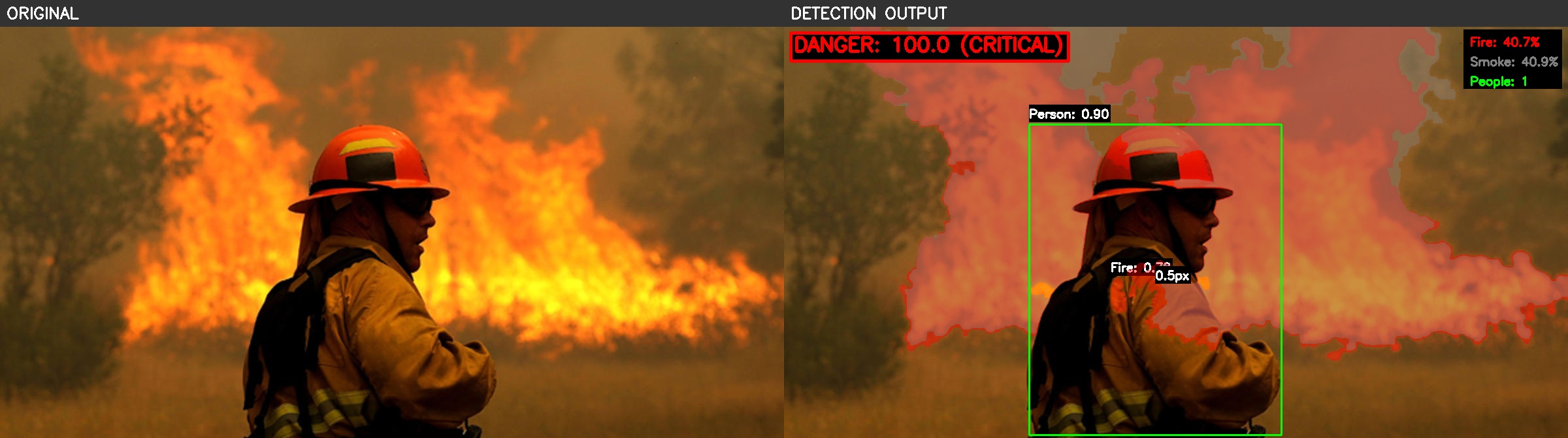 Our AI-driven multi-model fire risk detection system combines two complementary computer vision models to identify growing fires and detect people at risk in a timely manner, enabling first responders to intervene before harm occurs.