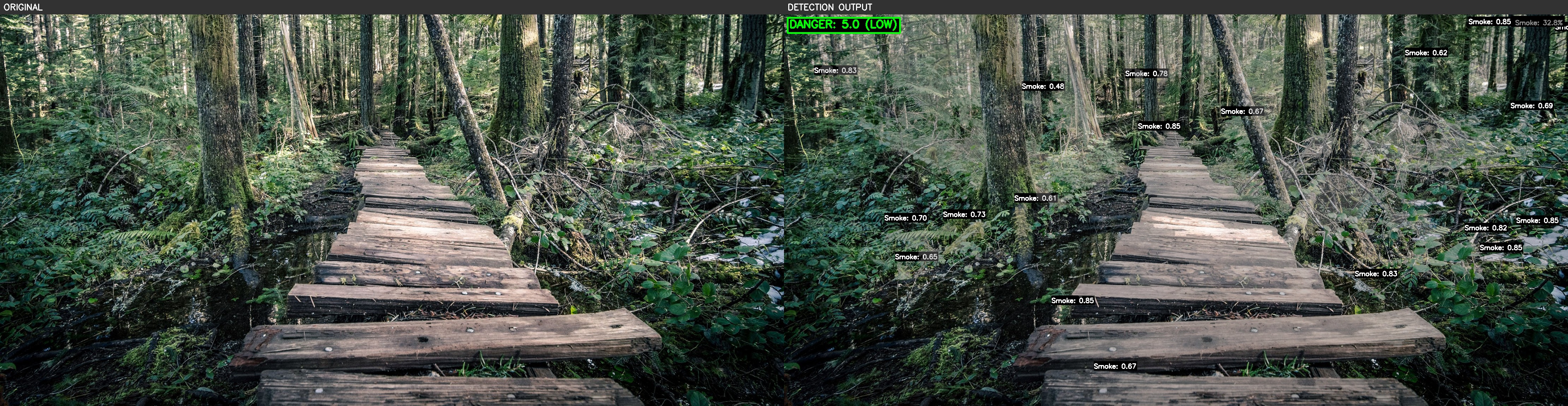 Relative high accuracy (with high confidence) in flagging images as High Danger and detecting people + fire using the real-time YOLOv8 video analysis model.