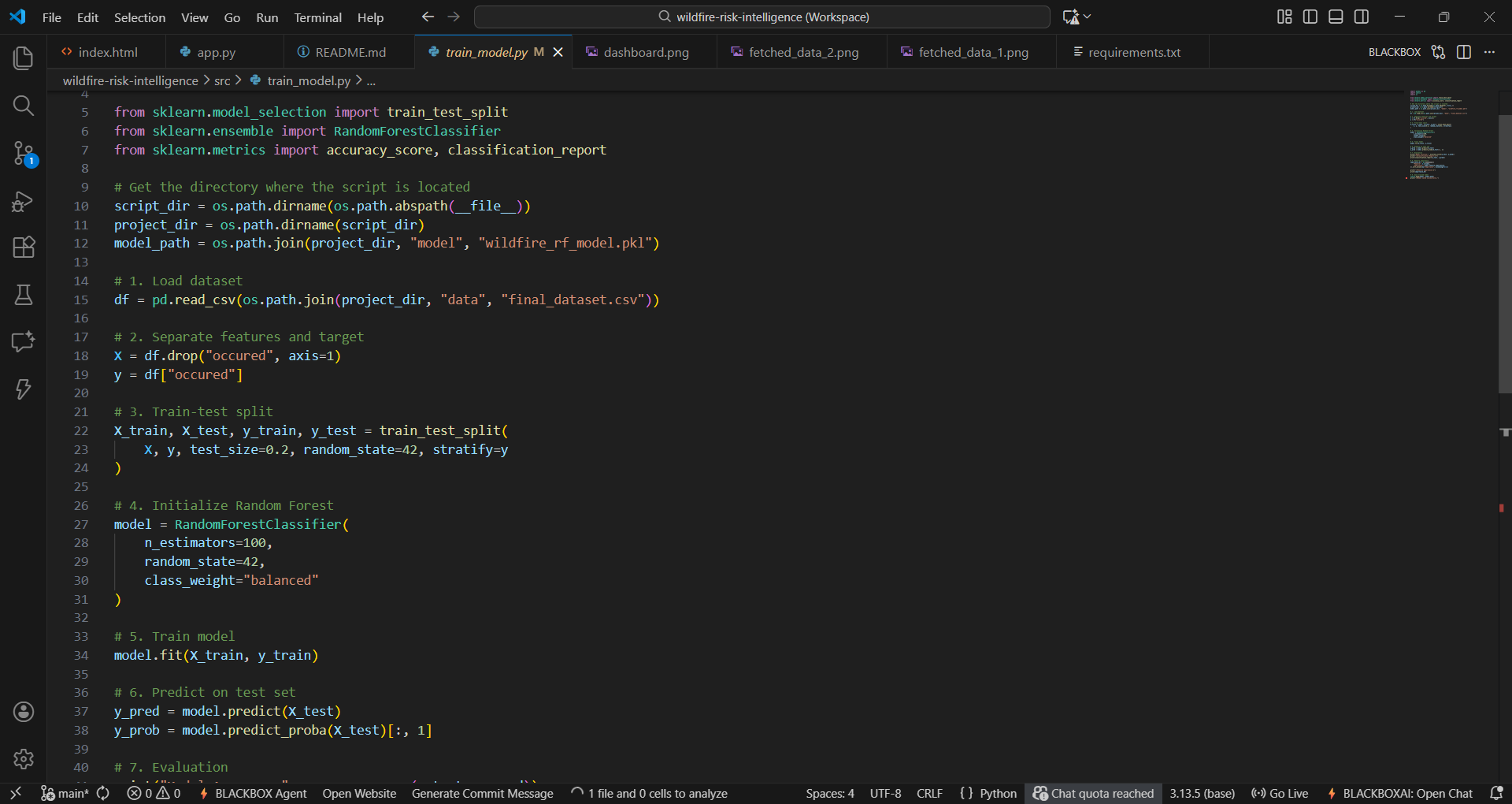 I trained a Random Forest classifier on historical wildfire and meteorological data, selecting key features such as temperature, humidity, wind speed, solar radiation, and pressure. Rather than chasing unrealistic accuracy, I emphasized explainability using feature importance scores.