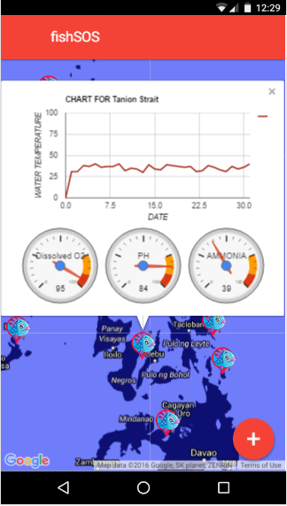 The FISHSOS Kit to measure the temperature, dissolved oxygen, ammonia level, PH Level of the body of water send it to the cloud and view real time data visualization with FISHSOS App.