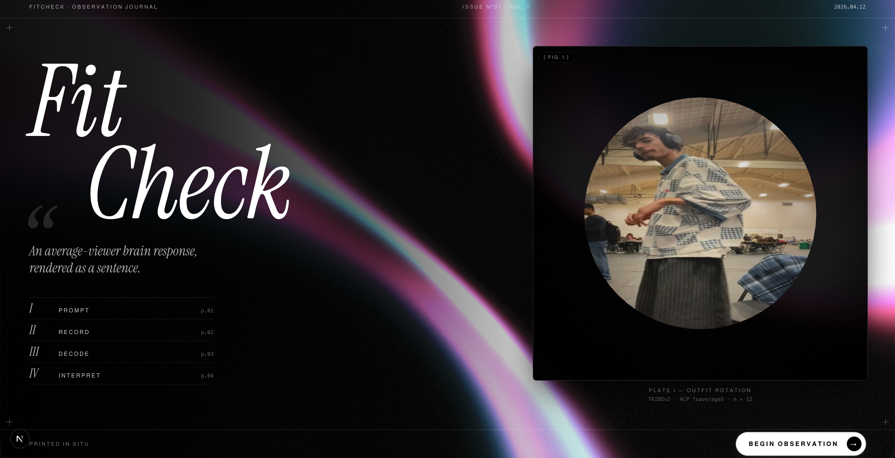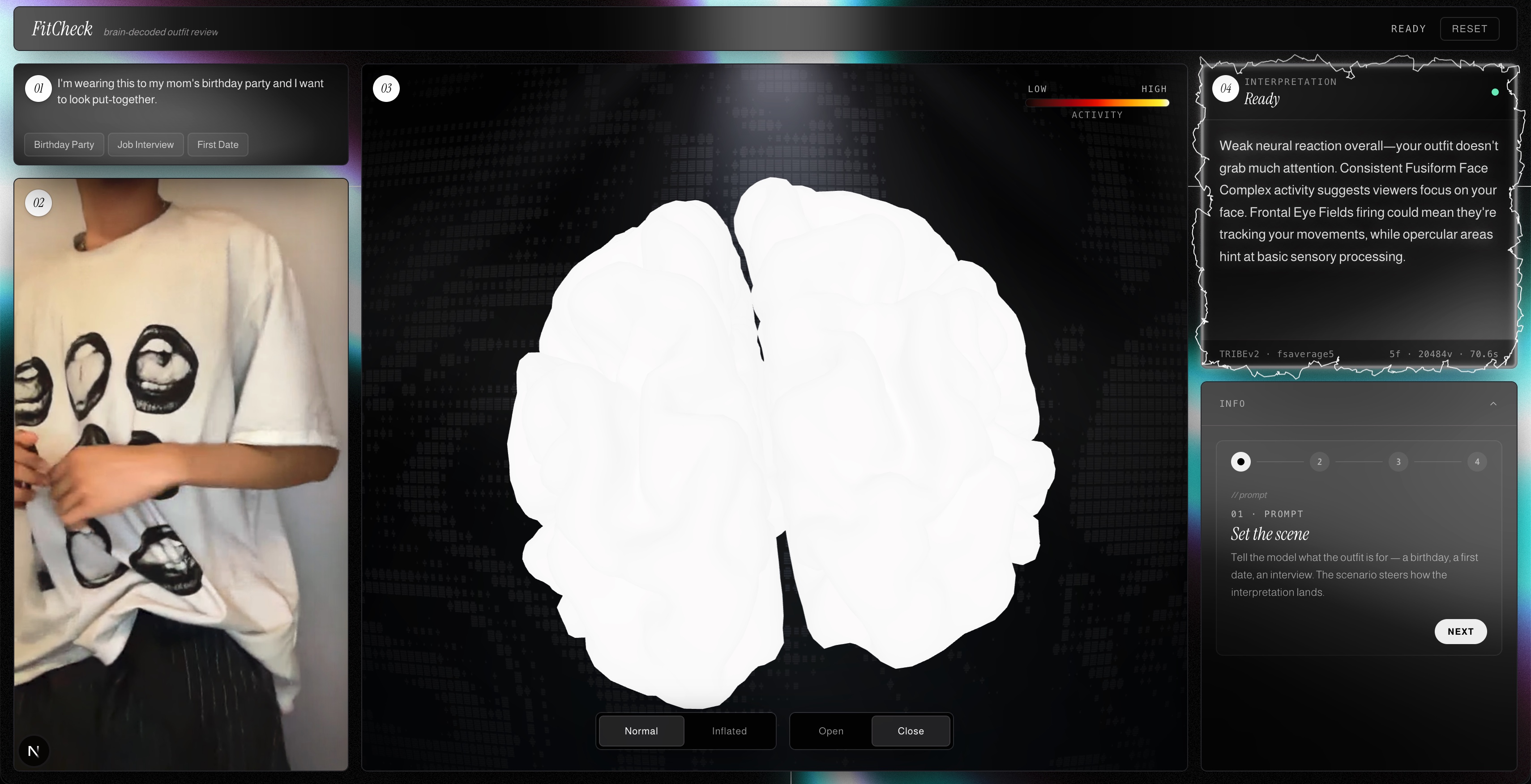 We kept seeing those "rate my outfit" posts everywhere and wondered, what if you could skip the comment section and go straight to the brain? Not metaphorically. Literally map what happens in someone's visual cortex when they look at your clothes. Meta Research published TRIBEv2 earlier this year, a model that predicts fMRI brain activity from video stimuli. It was built for neuroscience research, but we thought: what if we pointed it at a webcam and let people see how their outfit registers in the average viewer's brain?