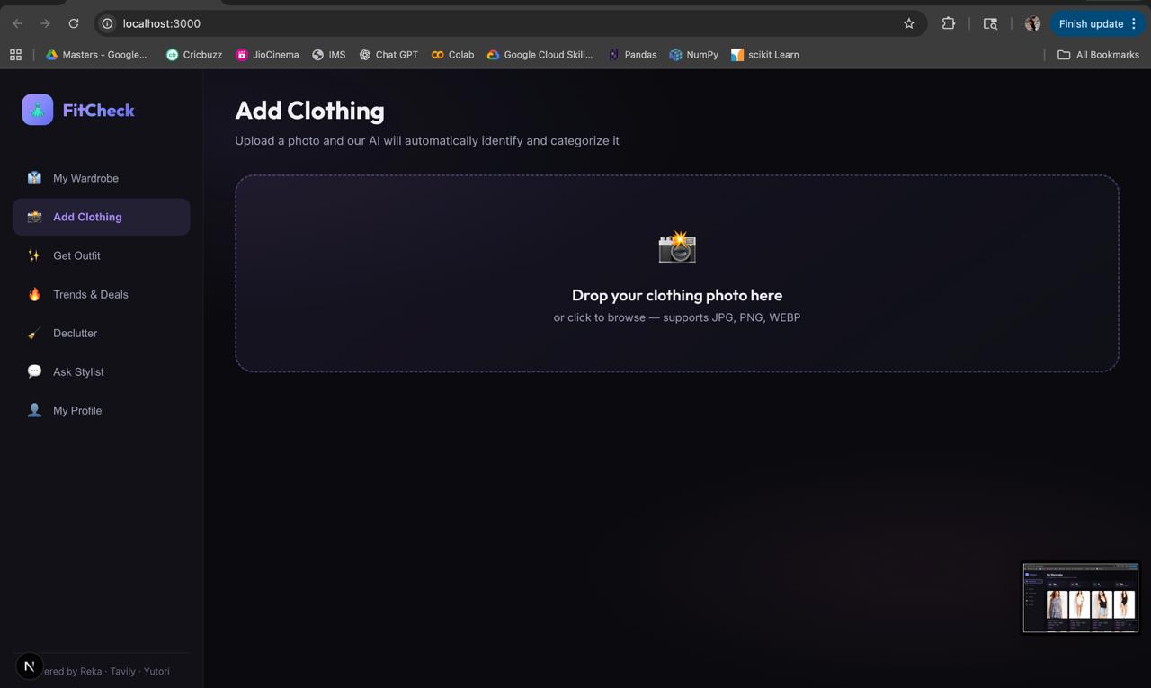 One of the biggest challenges was translating a messy real-world problem into clean technical components. A wardrobe is not naturally structured data. People own similar-looking items, clothes vary in fit and condition, and fashion preferences are subjective. Designing a system that could take simple photos and transform them into meaningful metadata was already a hard challenge.