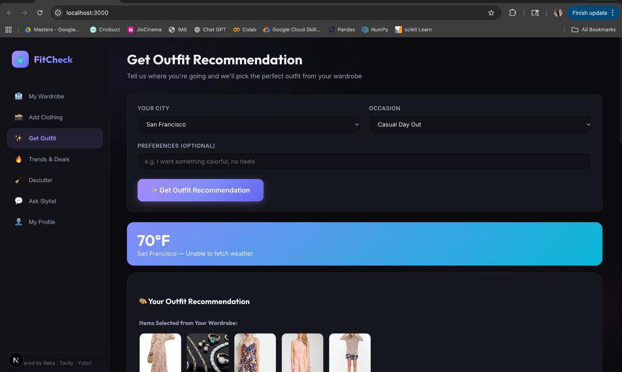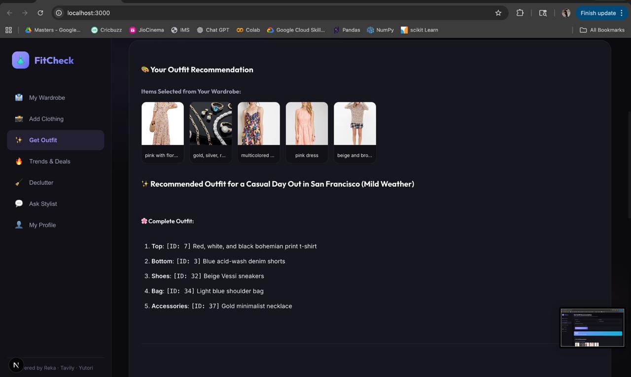 Another challenge was balancing utility with personal taste. For example, an outfit that fits the weather and occasion might still not feel right to the user. That means the system needs to go beyond rules and become more adaptive and personalized over time.