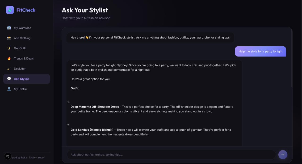 The fit-check visualization idea was also challenging because it adds another layer of complexity: it is not enough to recommend an outfit in text; the user should be able to see it. That introduces questions of realism, body representation, and whether the generated preview matches how the outfit would actually look.